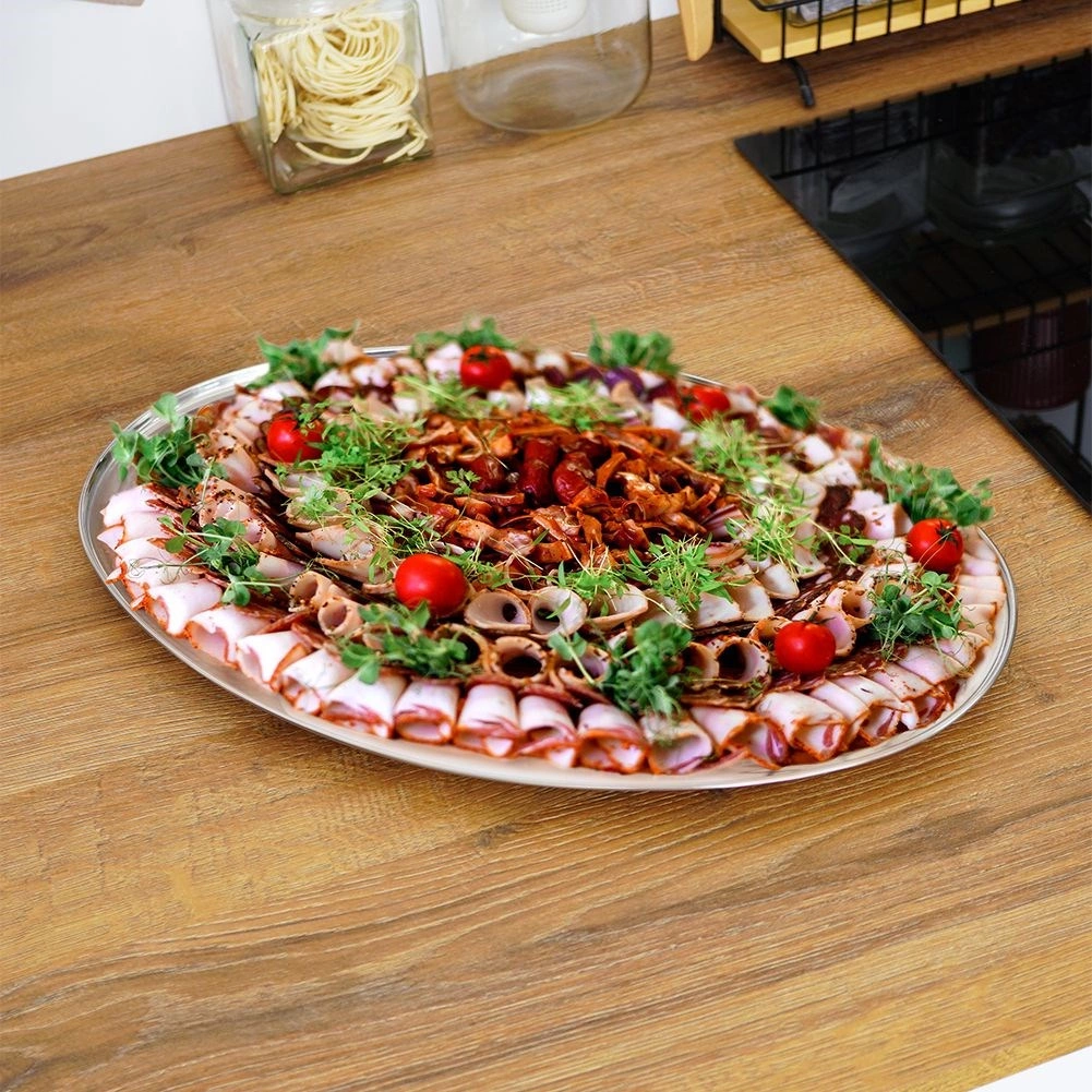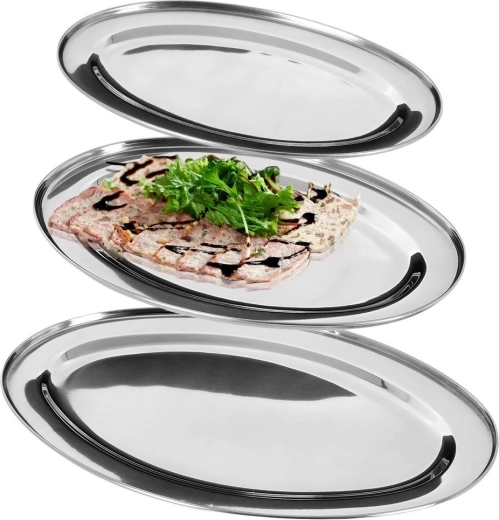 Set triju ovalnih poslužavnih pladnjeva od kvalitetnog nehrđajućeg čelika u univerzalnoj srebrnoj boji. Pladnjevi imaju zrcalno poliranu površinu koja se lako čisti i daje stolu reprezentativan izgled. Zahvaljujući čvrstoj izradi ne savijaju se i podnose svakodnevnu upotrebu.
