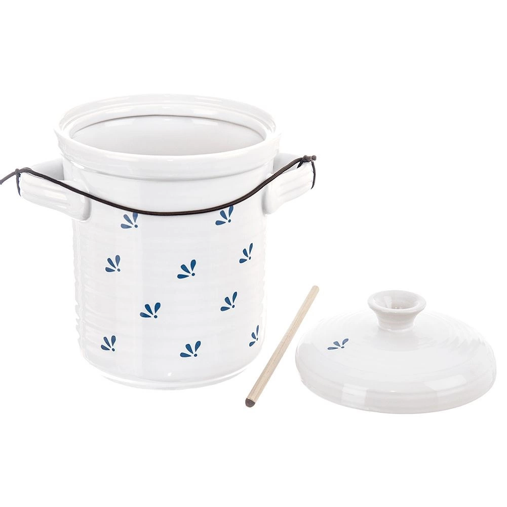Bijela glazirana keramika s plavim dekorom ne propušta svjetlo i pomaže održati stabilnu temperaturu, što je ključno za ukusne i hrskave rezultate fermentacije.