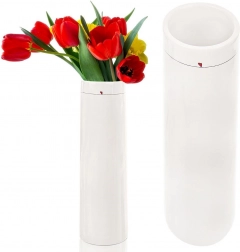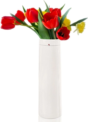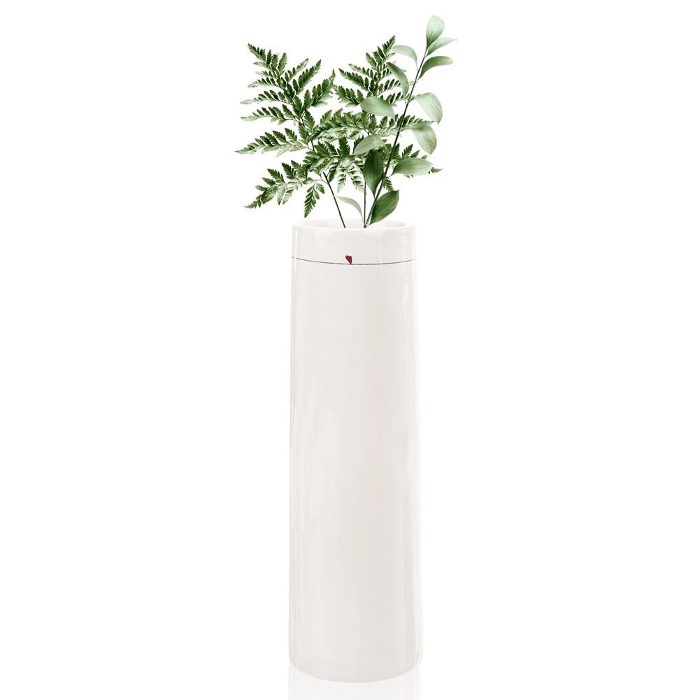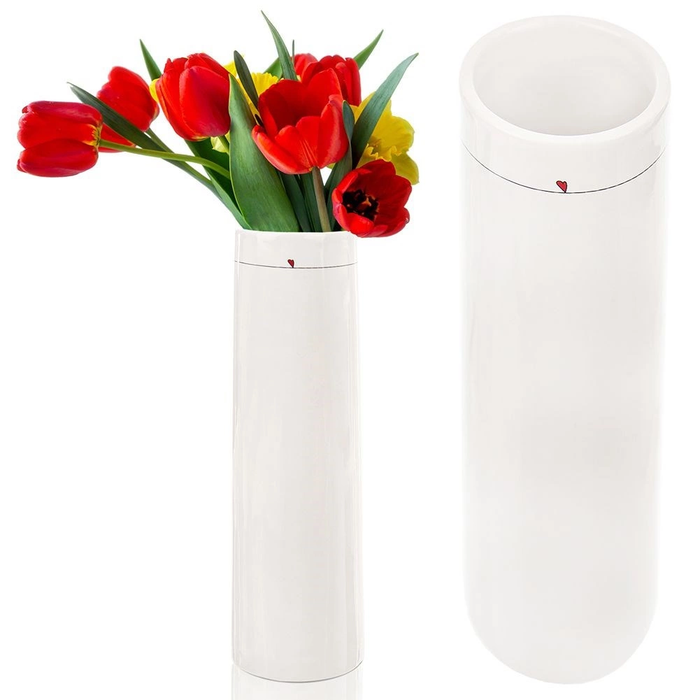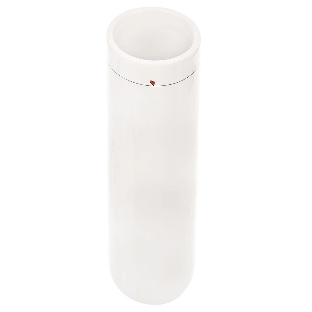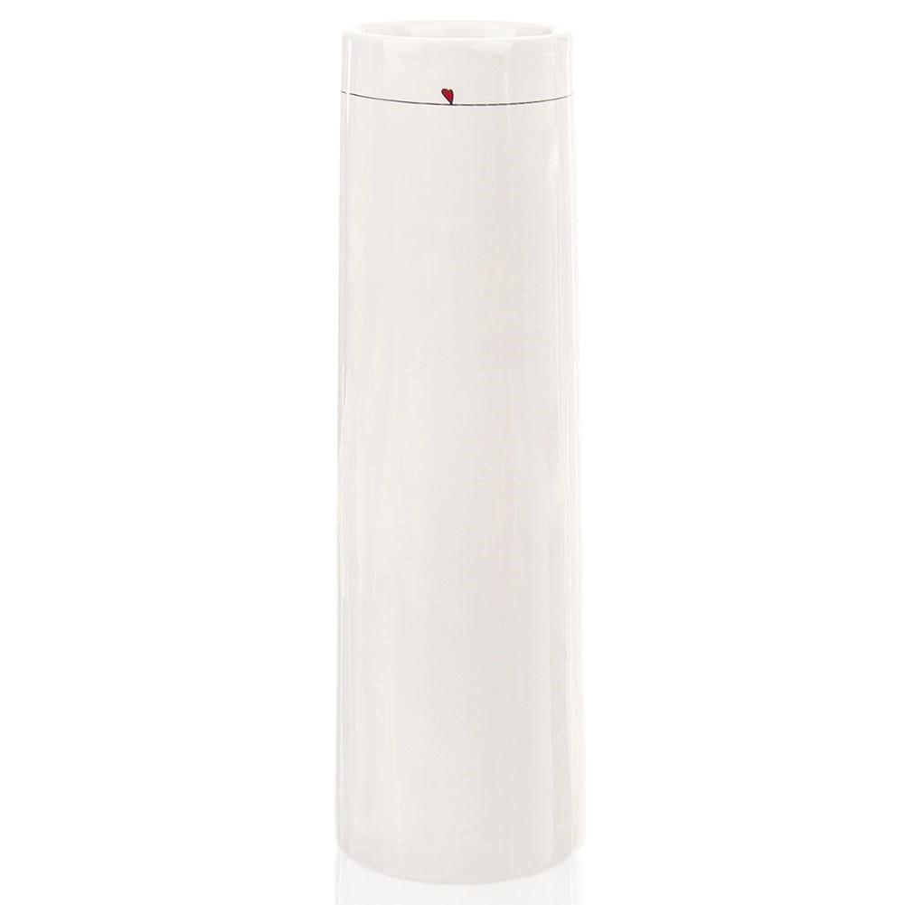Ova visoka, vitka vaza u bijeloj glazuri očarat će minimalističkim izgledom s malim crvenim srcem pri gornjem rubu. Prikladna je za manje i srednje bukete, eukaliptus ili sušene trave te se lako kombinira s modernim, skandinavskim i klasičnim stilom.