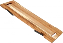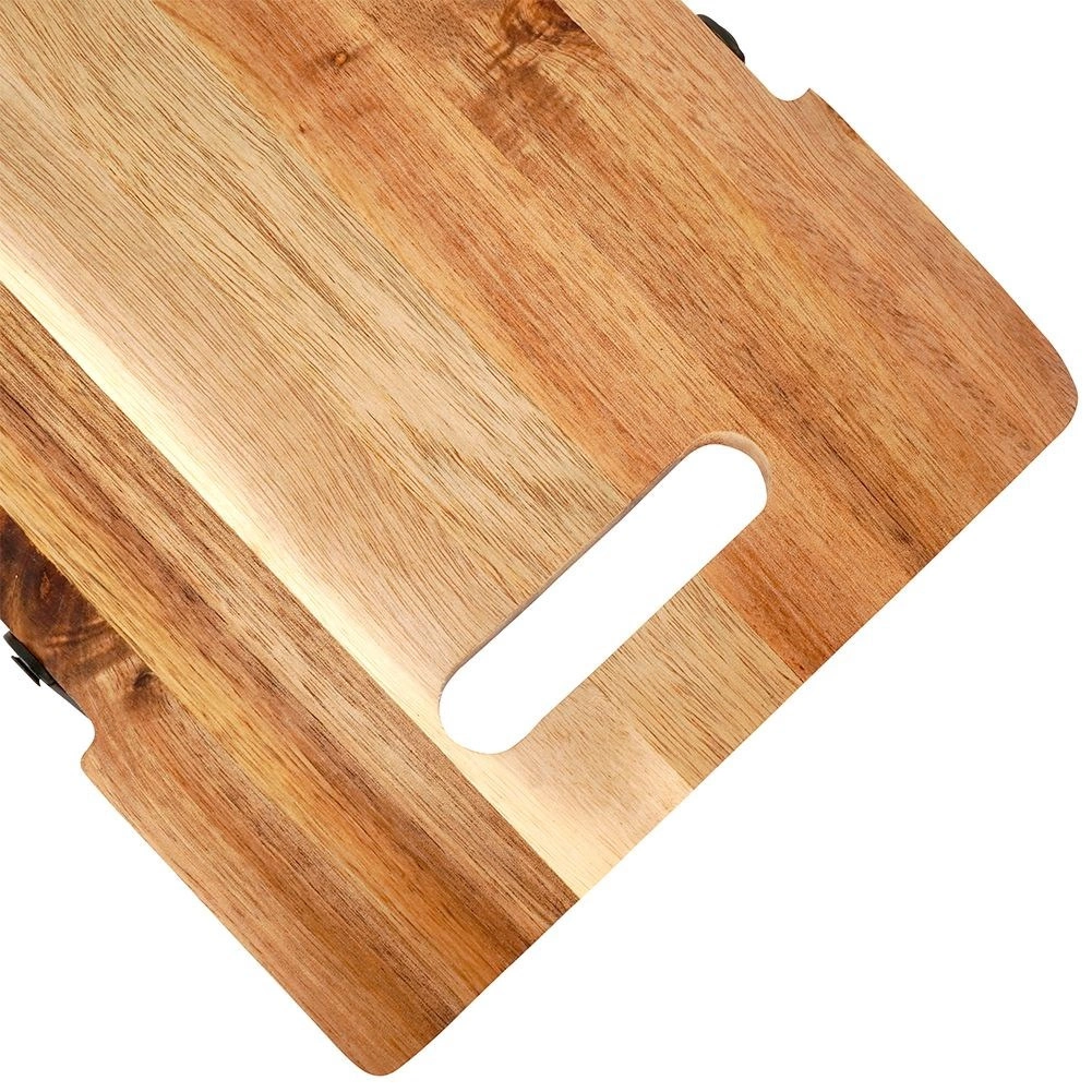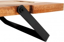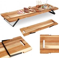 Ova duga poslužavna daska od bagremova drva na sklopivim metalnim nogama podiže prezentaciju vaših jela na višu razinu. Integrirani prihvati sa strana osiguravaju udobno i sigurno prenošenje, dok povišen položaj olakšava posluživanje i održava stol preglednim.