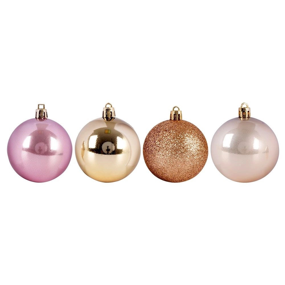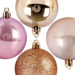 Sjajne, mat i blještave kuglice u ružičastim, bisernim i zlatnim tonovima stvaraju elegantnu i uravnoteženu blagdansku paletu.