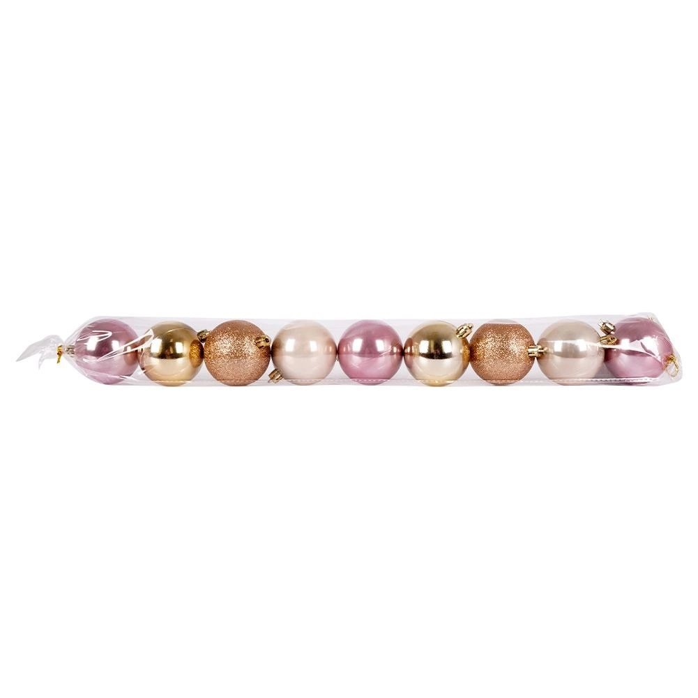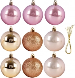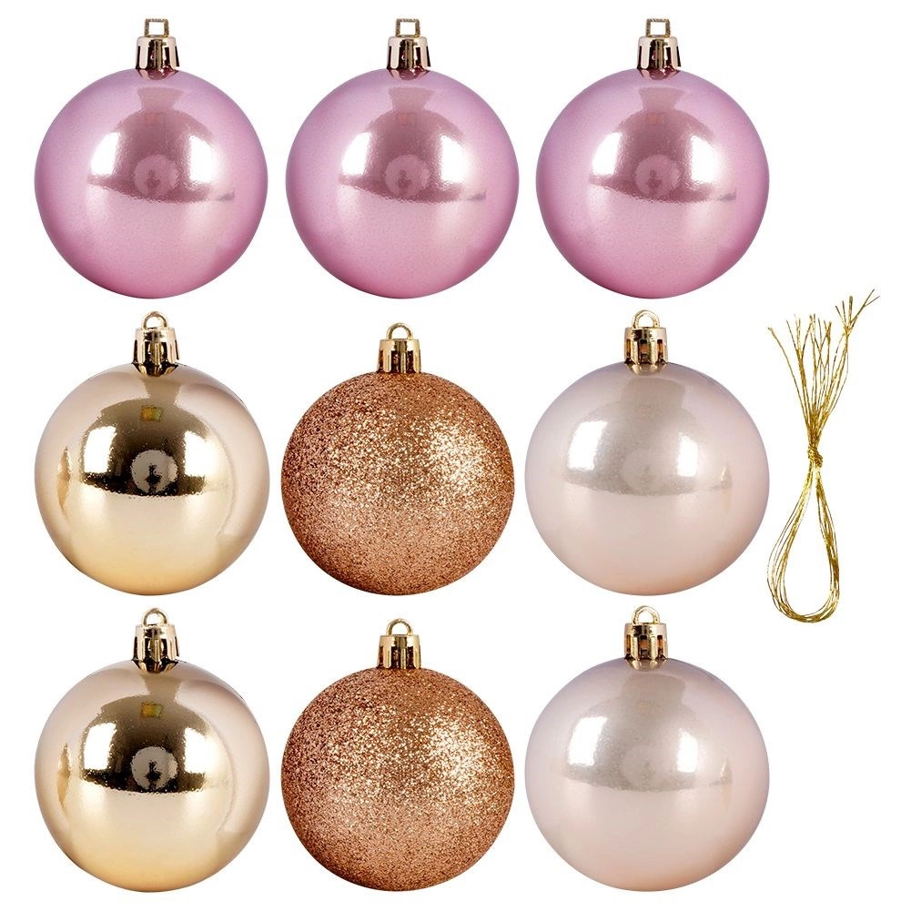 Podignite svoju božićnu dekoraciju univerzalnim setom od 9 nesalomljivih ukrasa u popularnim nijansama ružičaste, šampanjca i zlata. Kombinacija sjaja, mata i blještavila donijet će drvcu i aranžmanima stilski i moderan izgled koji se odlično uklapa u klasične i suvremene interijere.