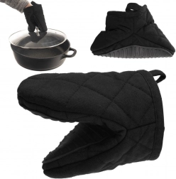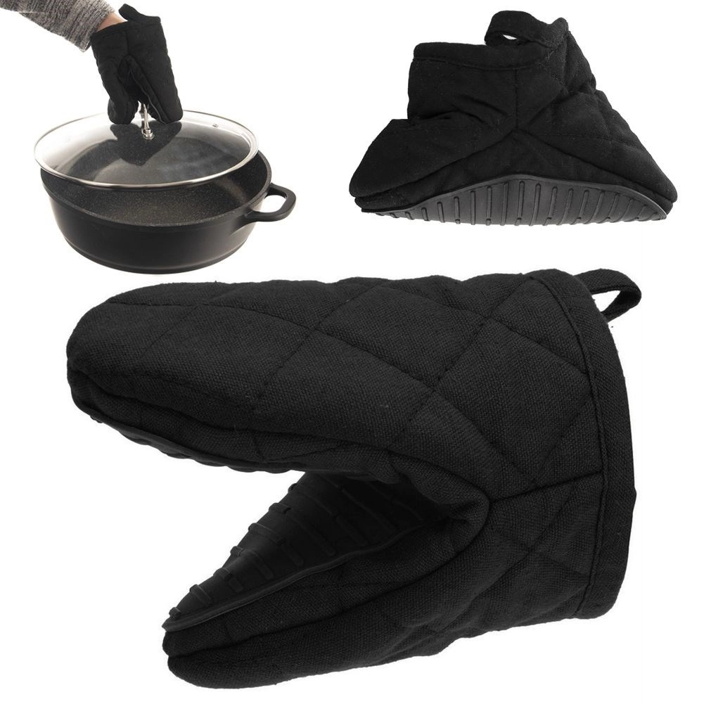 Ova izdržljiva kuhinjska rukavica u elegantnoj crnoj boji kombinira mekani pamuk s protukliznim silikonskim slojem s unutarnje strane za siguran i pouzdan hvat. Idealna je za svakodnevno kuhanje i pečenje, štiti dlanove pri rukovanju vrućim limovima, pekačima i loncima.