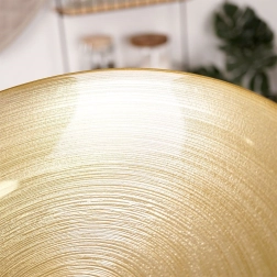 Stilska zlatna staklena zdjela postat će upečatljiv element vašeg stola. Zahvaljujući velikom promjeru od 30 cm i zapremnini od 2,2 litre pogodna je za posluživanje povrtnih i voćnih salata, grickalica ili voća, a ujedno služi i kao dekorativna zdjela.
