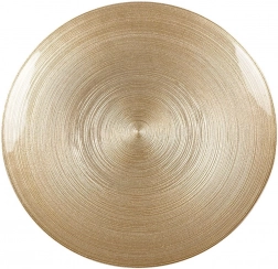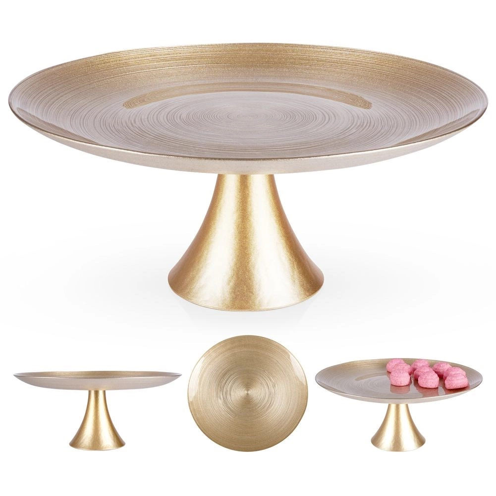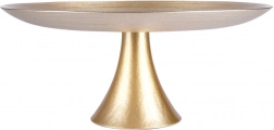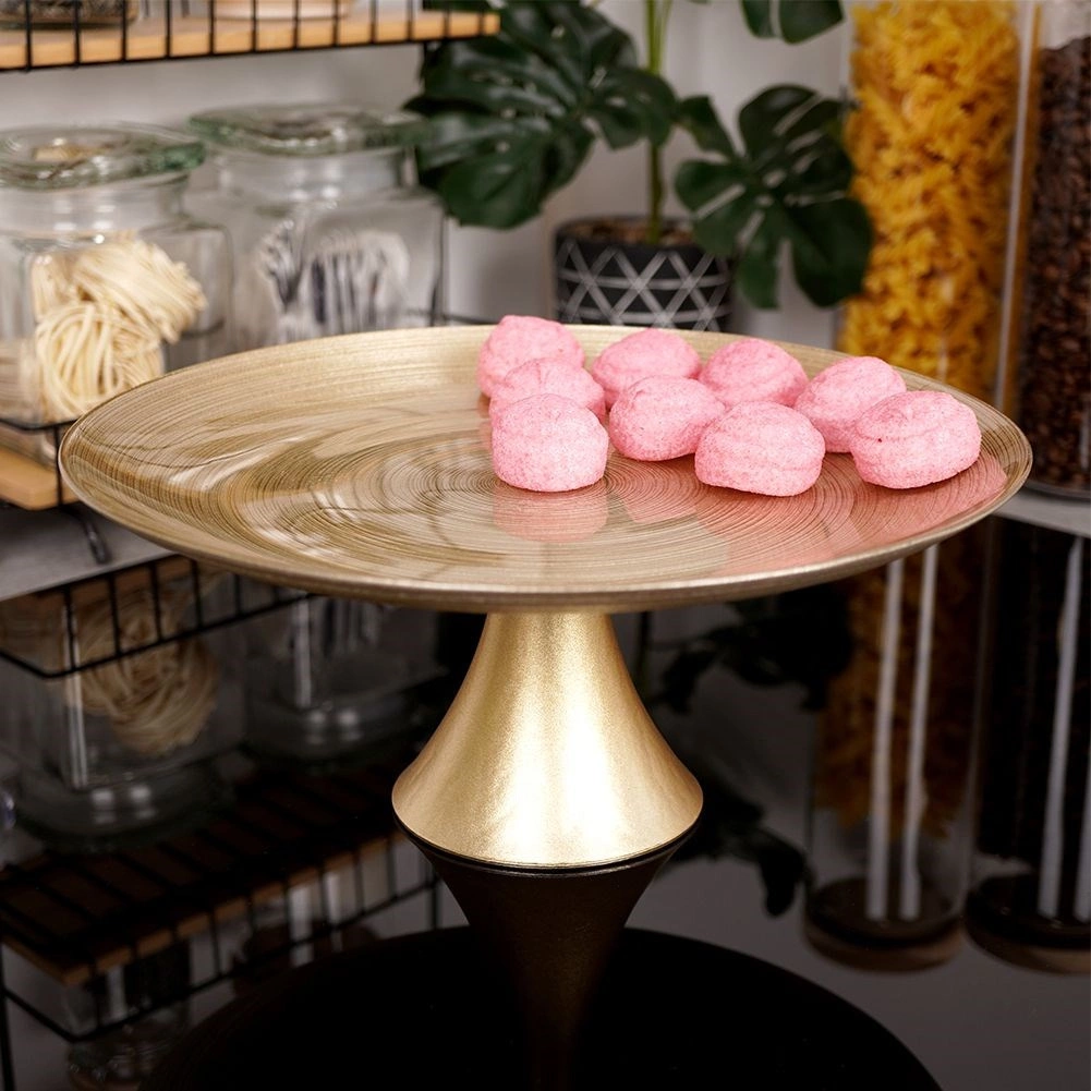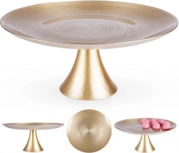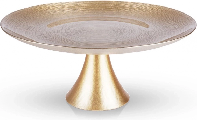 Elegantna staklena etažera na nozi promjera 28 cm i visine 11,5 cm idealna je za posluživanje torti, deserata i zakuske. Zahvaljujući zlatnoj boji i klasičnom obliku lijepo će se istaknuti na svakom stolu i efektno naglasiti slastice. Za očuvanje izgleda ne preporučuje se pranje u perilici posuđa.