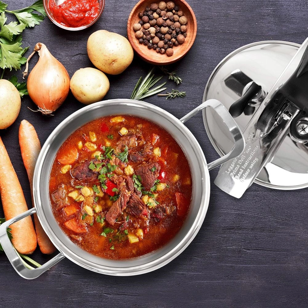 Uživajte u brzoj pripremi juha, mesa i mahunarki na svim vrstama ploča za kuhanje, uključujući indukciju. Troslojno akutermičko dno ravnomjerno raspoređuje toplinu, a uz mogućnost regulacije tlaka postižete savršene rezultate pri svakom kuhanju.