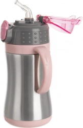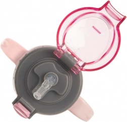 Poklopac s gumbom i sigurnosnim osiguračem štiti od samovoljnog otvaranja. Zahvaljujući preklopnom usniku i slamci nije potrebno naginjati šalicu pri pijenju, što će cijeniti i djeca i odrasli. Silikonska brtva minimalizira rizik od curenja tekućine – idealno za izlete, automobil i školsku torbu.