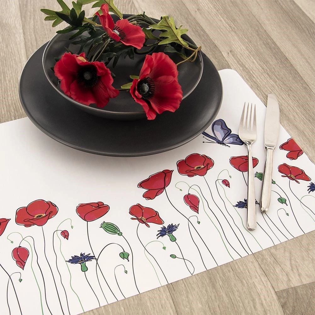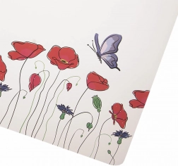 Praktičan i dekorativan podmetač u bijeloj boji s izraženim motivom crvenih makova i suptilnim detaljem leptira lijepo će upotpuniti vaš servis za jelo. Zahvaljujući pravokutnom obliku savršeno stane ispod tanjura i daje stolu skladan izgled.