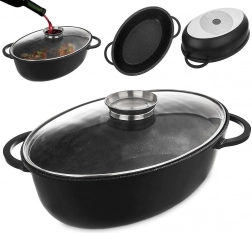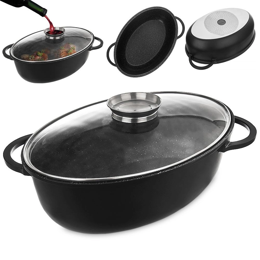 Ovaj ovalni pekač idealan je za pečenje, pirjanje i zapekanke većih porcija mesa, povrća i obiteljskih jela. Zahvaljujući neprianjajućem granitnom sloju PFLUON GRANIT pripremit ćete jela s manje ulja, a čišćenje je brzo i jednostavno. Stakleni poklopac omogućuje kontrolu tijekom kuhanja, a integrirani dozator u poklopcu olakšava podlijevanje vodom, vinom ili umakom bez potrebe za podizanjem poklopca.
