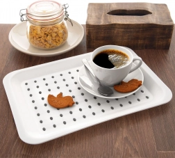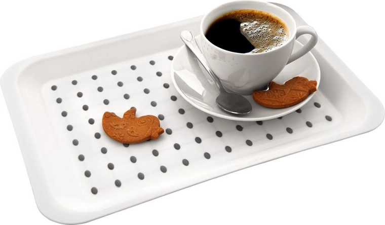 Poslužavnik je odličan za svakodnevnu upotrebu i za posluživanje gostiju na proslavama. Lagano se čisti, lagan je i zahvaljujući kvalitetnoj izradi podnosi dugotrajnu upotrebu. Univerzalna dimenzija 33 × 23 cm savršena je za prenošenje napitaka, deserata ili doručka u krevet.