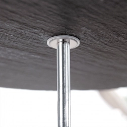 Okrugle ploče od škriljevca s prirodno cijepanim rubom daju postavljanju stola moderan, prirodan karakter i visoku izdržljivost.