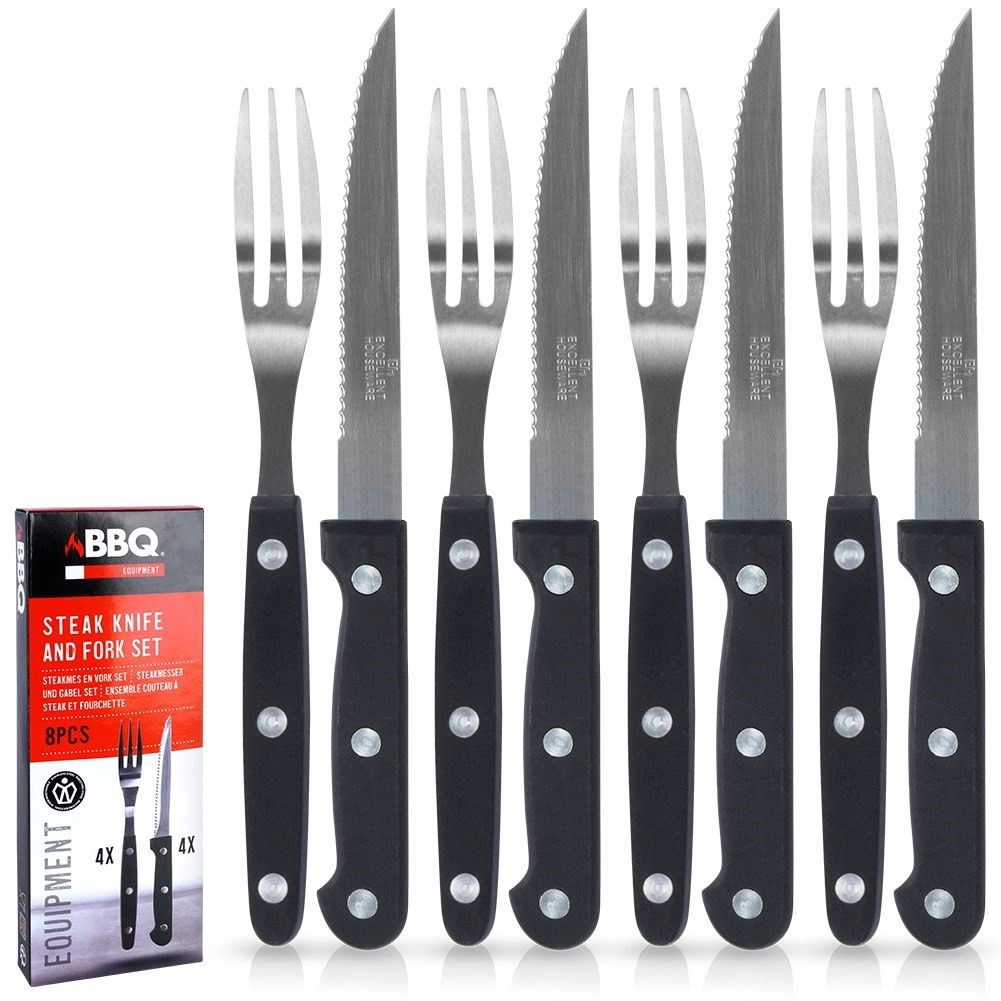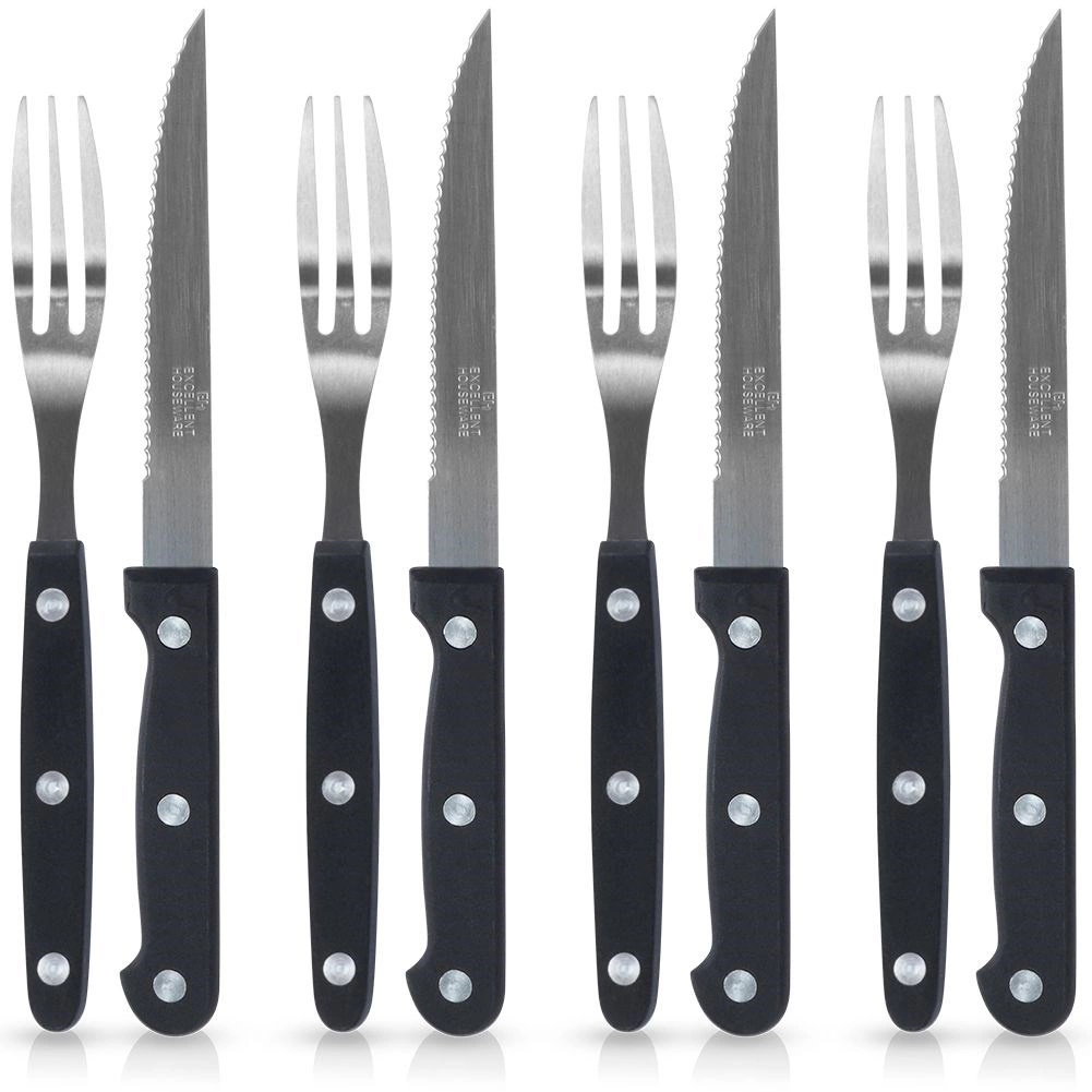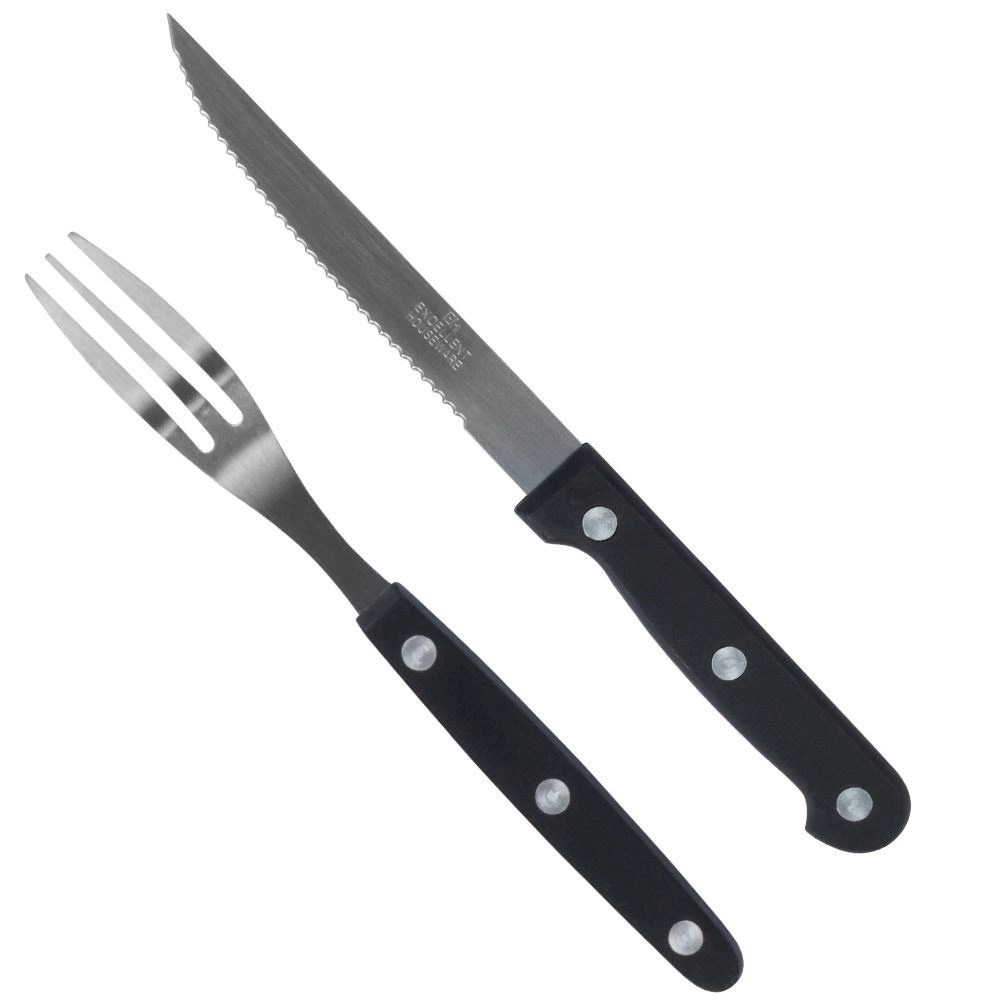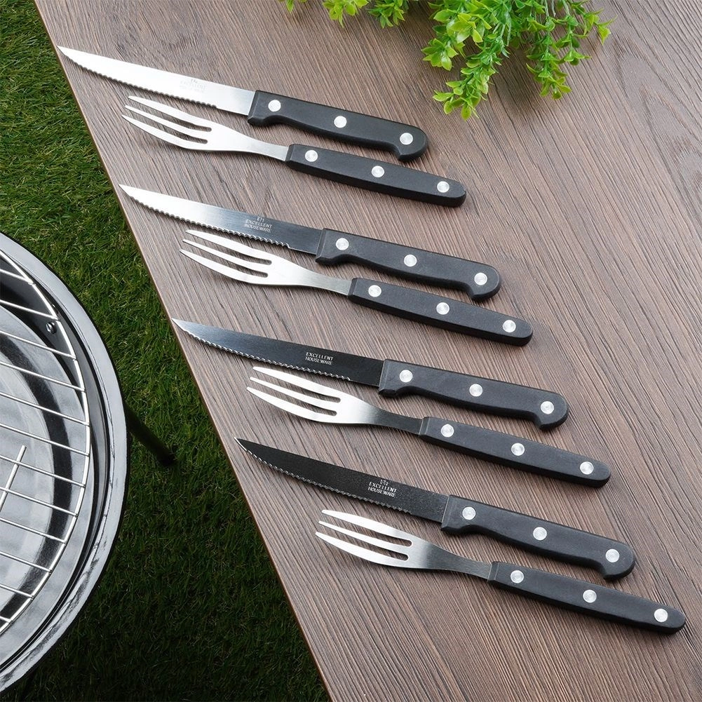 Uživajte u glatkom rezanju mesa bez trganja. Zupčasti noževi sa sječivom 11,5 cm od nehrđajućeg čelika režu sigurno i čisto, a vilice osiguravaju stabilan hvat. Ergonomske drške od crne, izdržljive plastike s trostrukim nitnama savršeno leže u ruci i pružaju kontrolu pri rezanju.