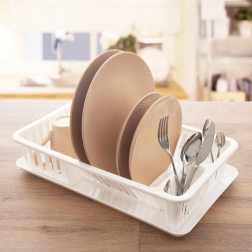 Održite red oko sudopera i ubrzajte sušenje posuđa s kompaktnim ocjeđivačem koji spaja funkcionalnost i čist, univerzalan izgled. Bijela plastika se lako održava, a odvojiva podloška skuplja vodu te tako štiti radnu plohu od vlage i mrlja.