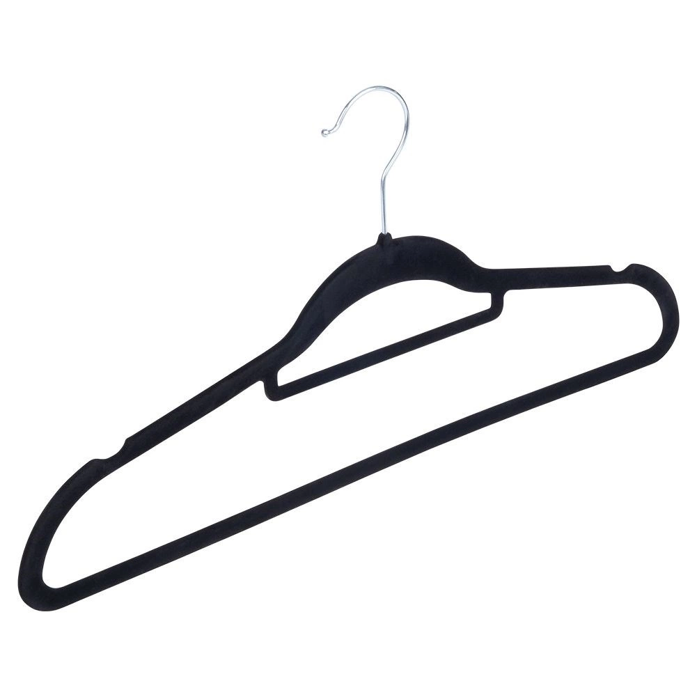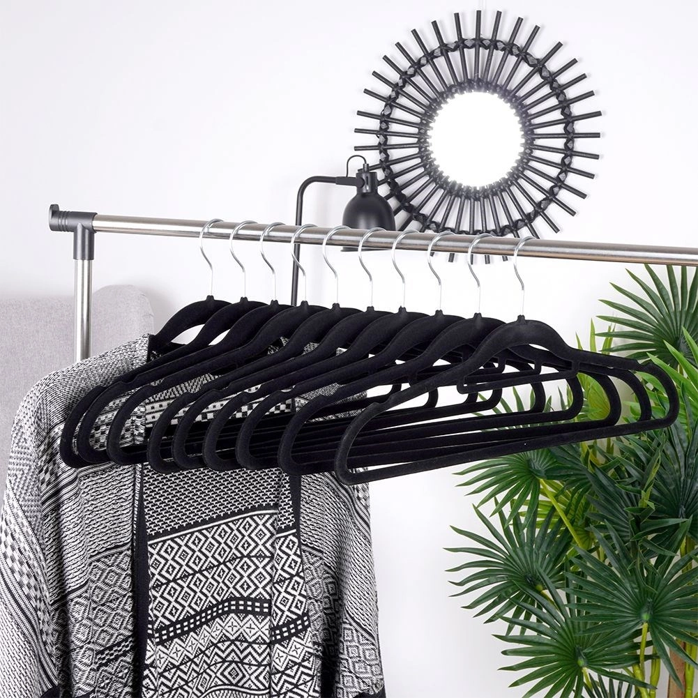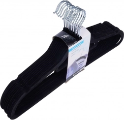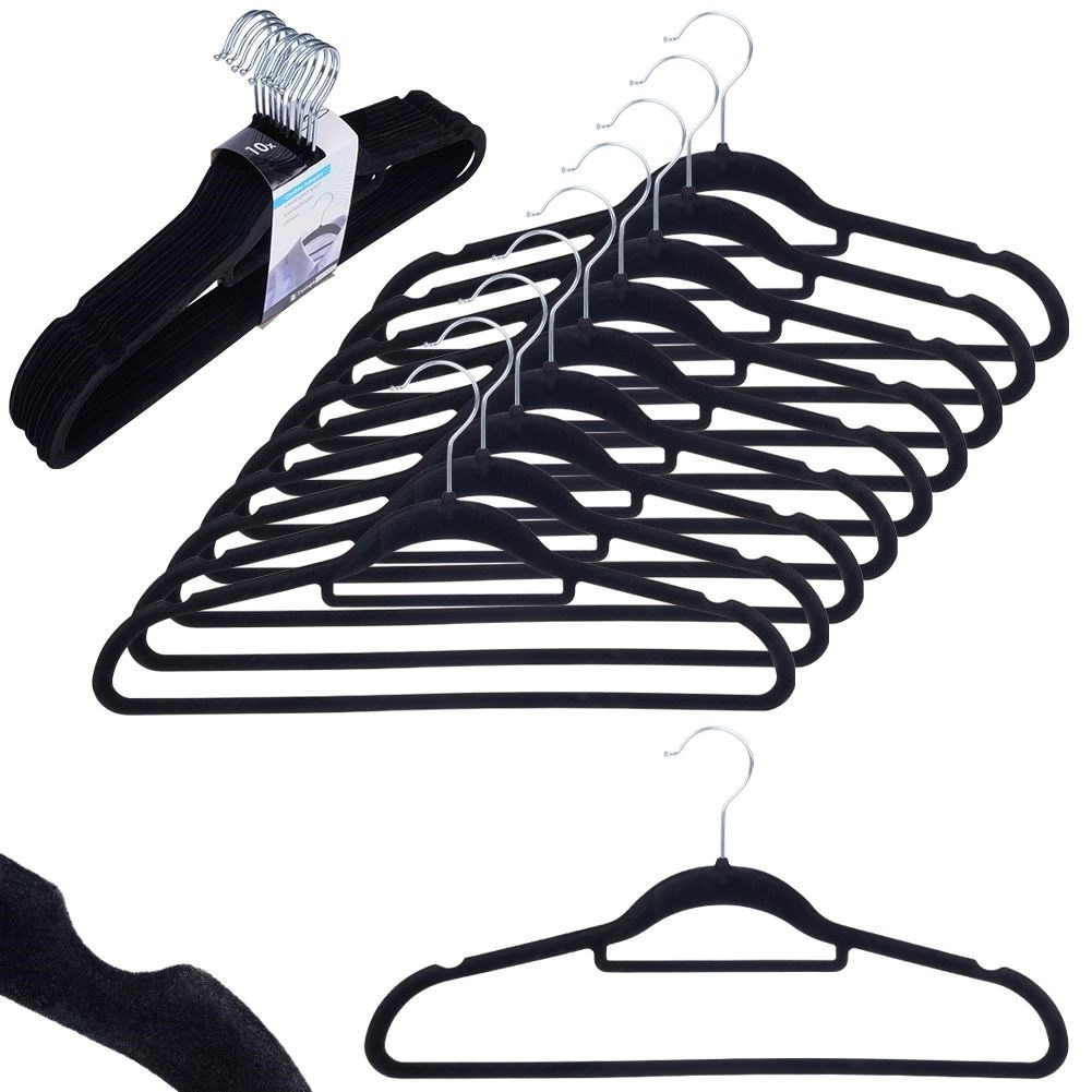 Praktičan set od 10 tankih vješalica s nježnom baršunastom površinom pomaže održati ormar preglednim i štedi prostor. Protuklizna obrada drži odjeću sigurno na mjestu, dok rotirajuća metalna kukica olakšava vješanje u bilo kojem smjeru.