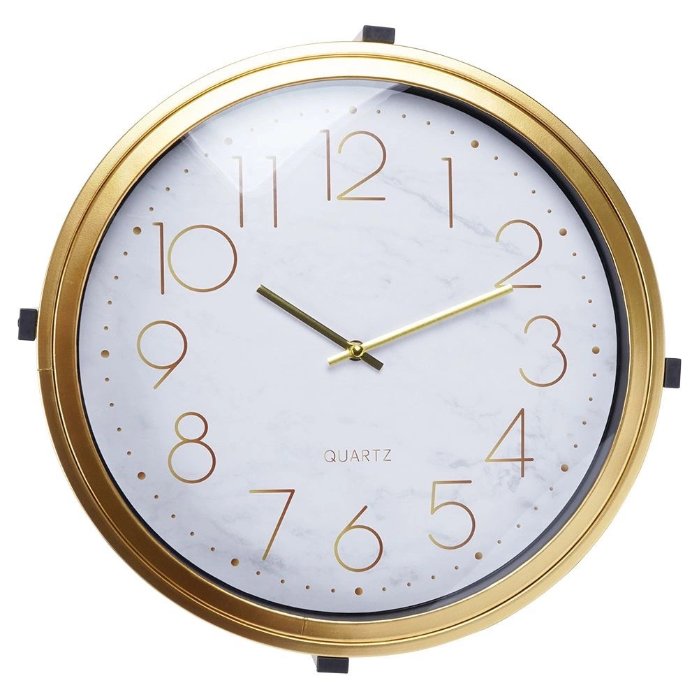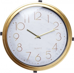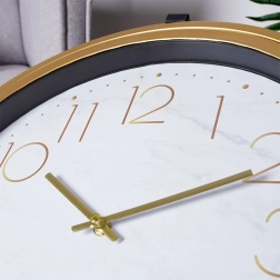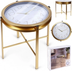 Ovaj originalni stolić 2 u 1 kombinira funkciju malog odlagališnog stolića i zidnog sata izravno u ploči. Sat je zaštićen čvrstim staklom, a zahvaljujući bijeloj podlozi i zlatnim detaljima izvrsno je čitljiv i iz daljine. Elegantna zlatna izvedba pristaje modernim i klasičnim interijerima te postaje upečatljiv dekorativni element.
