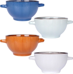 Zdjelice u skladnim bojama (bijela, plava, narančasta/svjetlosmeđa i siva) imaju stilski riblji/chevron reljef i kontrastni rub, zahvaljujući čemu odlično izgledaju na svakom stolu. Savršene su ne samo za juhe i kreme, već i za žitarice, jogurt, voće, salate ili slane i slatke grickalice.