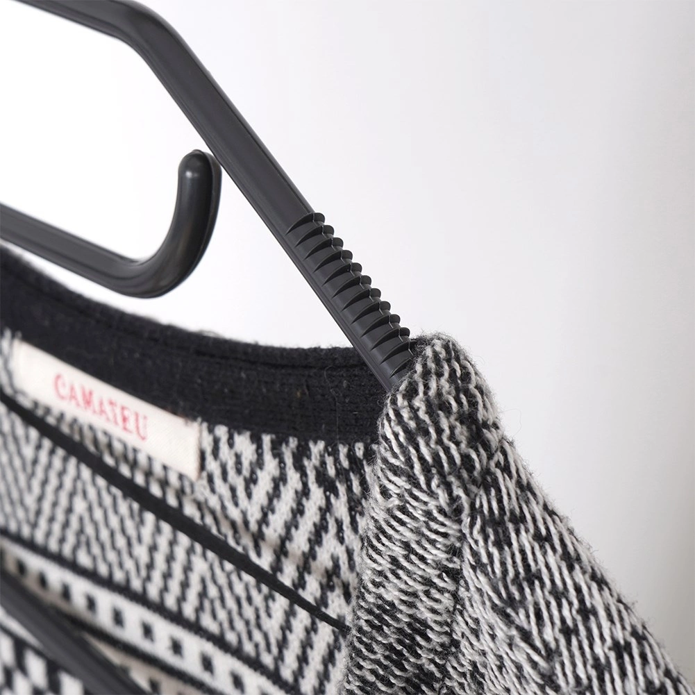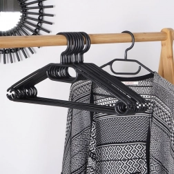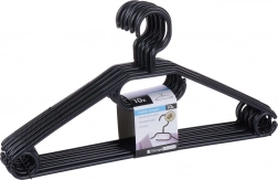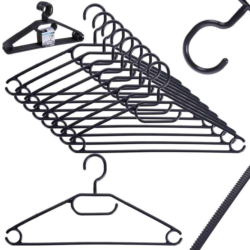 Održite svoju garderobu preglednom uz set od 10 kvalitetnih vješalica u elegantnoj crnoj boji. Zahvaljujući rotirajućoj kuci lako ih smjestite u bilo koji ormar, dok više točaka za vješanje omogućuje kačenje košulja, sakoa, suknji, hlača i dodataka poput šalova ili kravata.