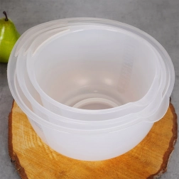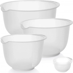 Ovaj set kuhinjskih zdjela od kvalitetne poluprozirne plastike pokriva većinu zadataka u kuhinji – od miješanja tijesta i miksanja krema do pripreme salata. Zdjele se lako umeću jedna u drugu, čime štede prostor u ormariću, a zahvaljujući mjernoj skali na stijenci precizno ćete izmjeriti tekuće i sypke sastojke.