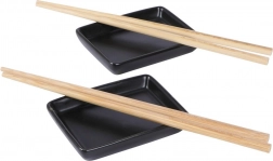 Dvije crne keramičke zdjelice savršene su za soja umak, wasabi ili ukiseljeni đumbir. Bambusni štapići dobro leže u ruci i omogućuju precizno uzimanje zalogaja.