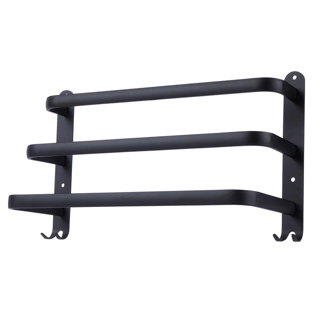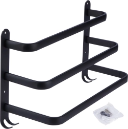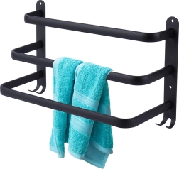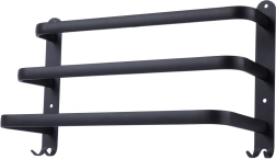 Stilizirani i izdržljivi držač za ručnike za preglednu organizaciju vaše kupaonice. Tri horizontalne šipke omogućuju učinkovito sušenje i provjetravanje ručnika, dok četiri kukice u donjem dijelu nude mjesto za spužvice ili dodatke. Minimalistički dizajn u mat crnoj naglašava interijere u skandinavskom, modernom i loft stilu.