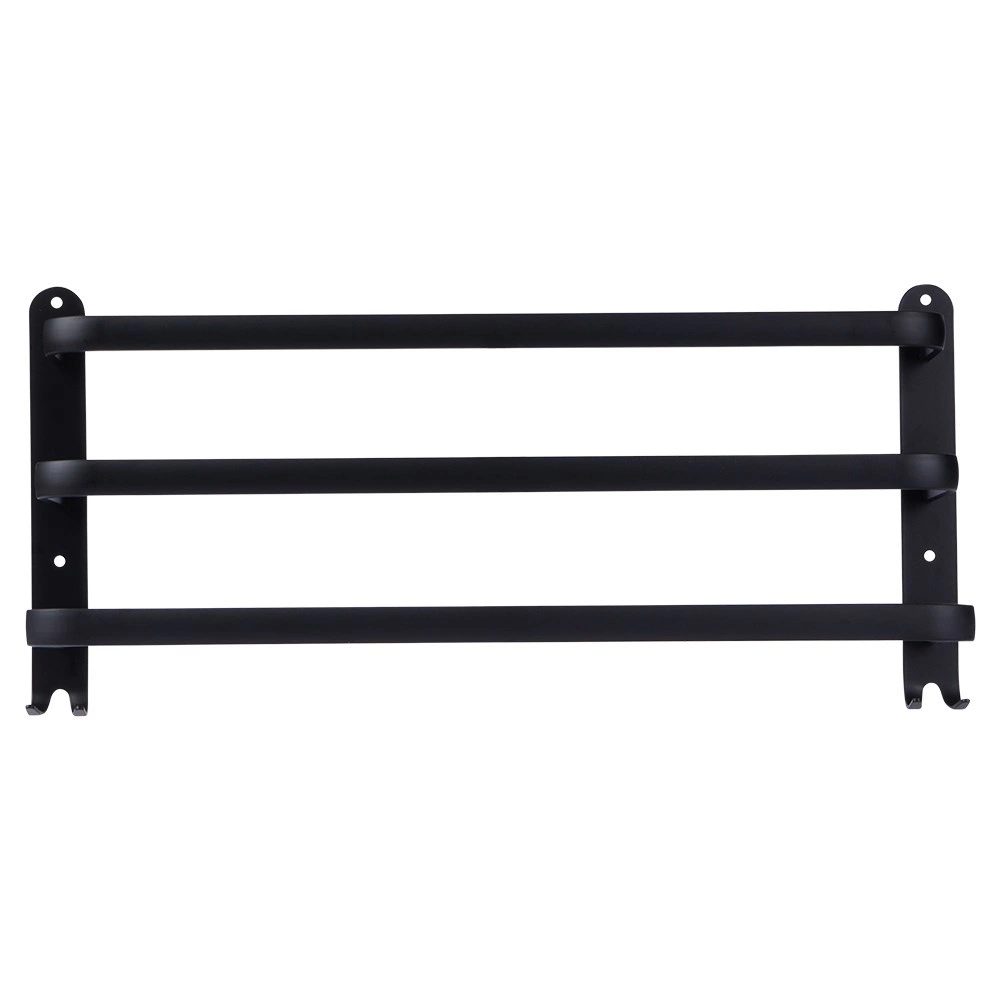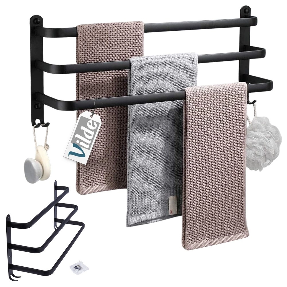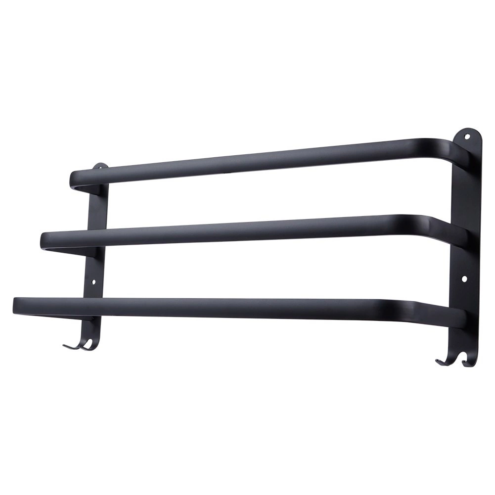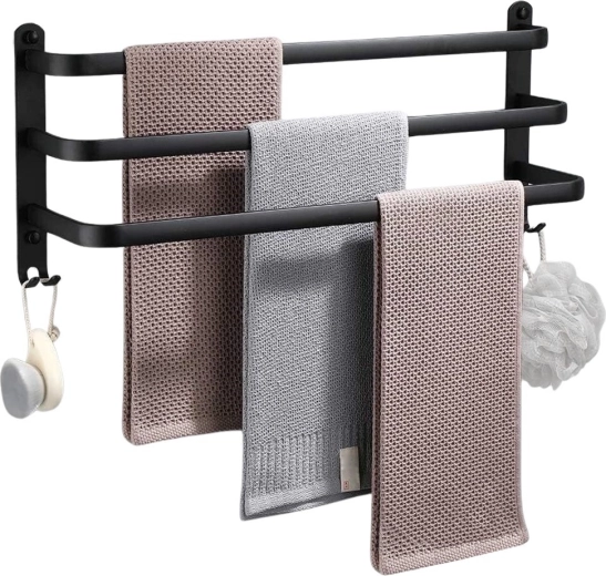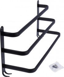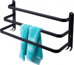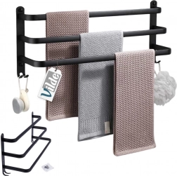 Maksimalno iskoristite prostor u svojoj kupaonici s praktičnim držačem za ručnike duljine 50 cm. Robusna aluminijska konstrukcija s mat crnim završetkom je otporna na vlagu i ujedno stilská. Tri odvojene šipke omogućuju bolju cirkulaciju zraka i brže sušenje, dok četiri donje kukice pružaju mjesto za spužvice ili četke.