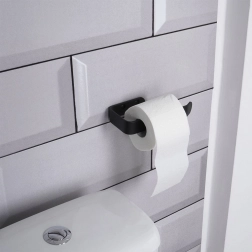 Elegantni držač za toaletni papir od kvalitetnog metala u mat crnoj boji odlično nadopunjuje modernu i klasičnu kupaonicu. Otvorena konstrukcija omogućuje brzu zamjenu role i glatko odmatanje papira.