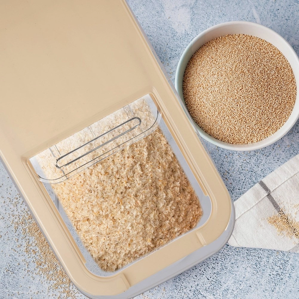 Organizirajte kuhinju, ostavu i kupaonicu s univerzalnim spremnikom zapremnine 10 l. Prozirno izvedenje omogućuje brzu kontrolu stanja zaliha, dok klizni poklopac osigurava udoban i brz pristup bez potrebe za otvaranjem cijele kutije. Idealno za tjesteninu, brašno, žitarice, rižu, ali i za sredstva za pranje rublja, tablete za perilicu posuđa te granule i poslastice za životinje.