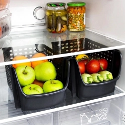 Univerzalna košara od izdržljive plastike bez BPA idealna je za svakodnevnu organizaciju kuhinje. Perforirane stranice potiču cirkulaciju zraka, što pomaže održati voće i povrće dulje svježim. Otvoreni prednji izrez omogućuje brzo umetanje i vađenje sadržaja, bilo da košara stoji na radnoj plohi ili je smještena na polici.