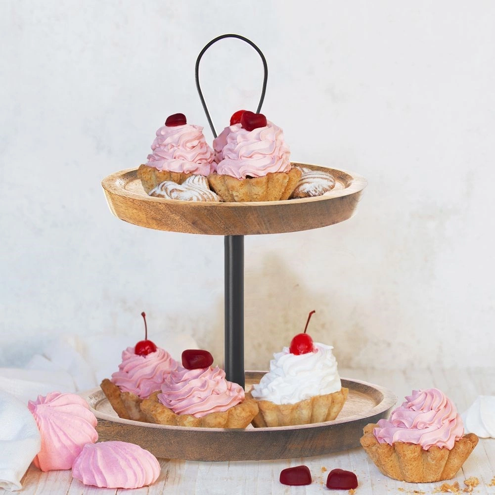 Unesite eleganciju i red u serviranje. Drvena dvoslojna etažera od mangovog drva omogućuje efektno izlaganje cupcakeova, kolačića, deserata, voća i slanih kanapea. Zahvaljujući dvama razinama različitih promjera lako ćete uštedjeti prostor na stolu uz preglednu prezentaciju.