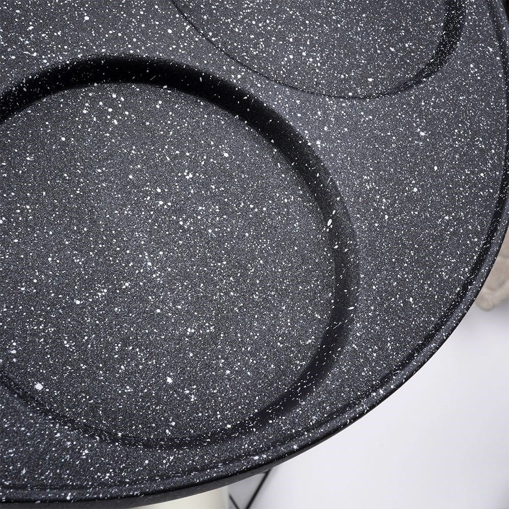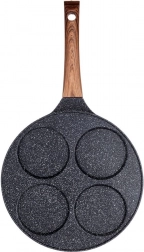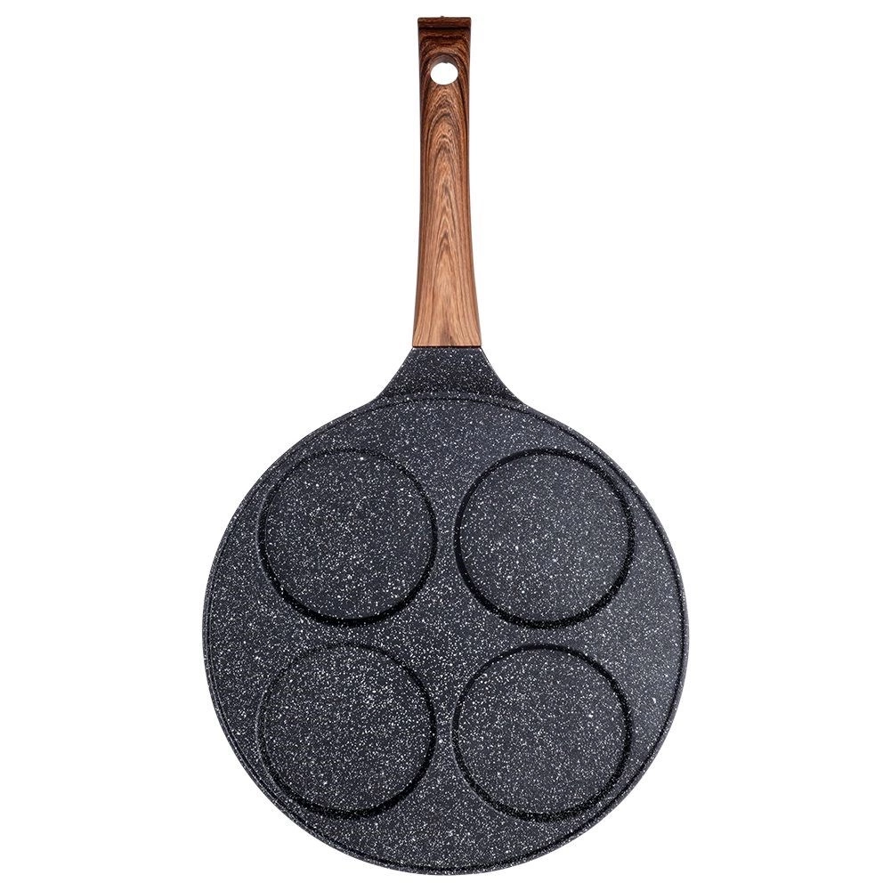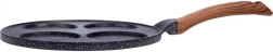 Stilizirana tava iz linije BLACK&WOOD u popularnoj kombinaciji crnog kamenog izgleda i drva olakšava pripremu jaja, malih palačinki i mini pancakes. Četiri predviđena otvora pomažu održati idealan oblik i veličinu, dok aluminijsko tijelo s ravnomjernom raspodjelom topline skraćuje vrijeme kuhanja i štedi energiju.