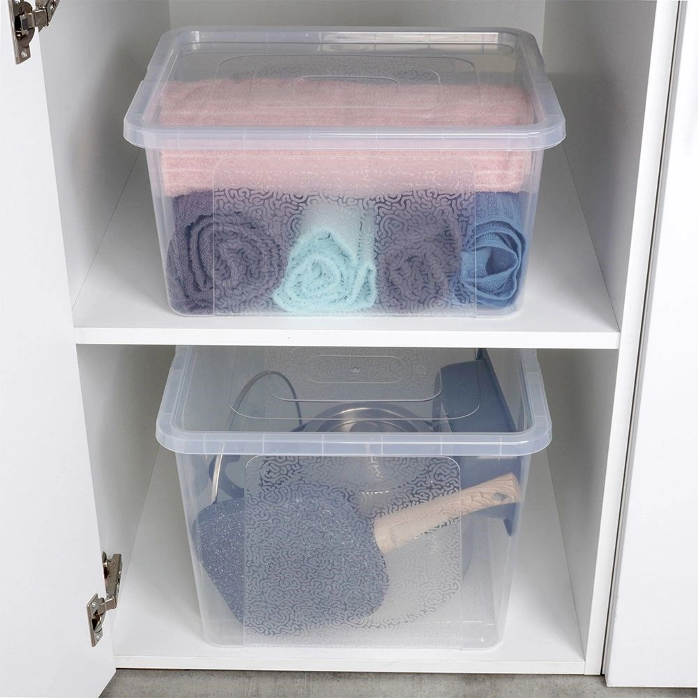 Transparentan materijal omogućuje trenutačan uvid u sadržaj bez otvaranja poklopca – idealno za pregledno spremanje tekstila, igračaka i uredskog pribora.