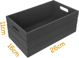Praktična drvena kutijica u elegantnoj crnoj boji pomaže održati red u svakoj prostoriji. Izrađena je od izdržljivog drveta, ima integrirane rukohvate za lako prenošenje i kompaktne dimenzije 26 × 16 × 11 cm. Odlično odgovara za kozmetiku, uredski pribor, začine, kuhinjske pomagala i sitnu odjeću. Univerzalna, izdržljiva i dekorativna – savršeno se uklapa u klasične i moderne interijere.