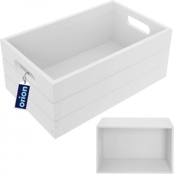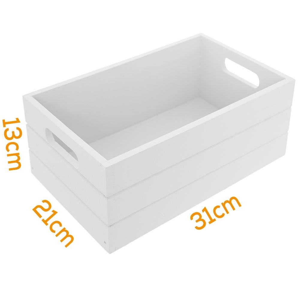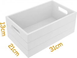 Praktična drvena kutija u bijeloj boji za pregledno odlaganje stvari u kućanstvu i uredu. Ima kompaktne dimenzije 31 × 21 × 13 cm, integrirane ručke za lako prenošenje i čvrstu, stabilnu konstrukciju. Odlična je za kozmetiku, papirnicu, začine, kuhinjske potrepštine ili sitnu odjeću. Zahvaljujući čistom dizajnu služi i kao dekorativni element ili organizator za police, komode i radni stol.