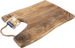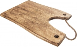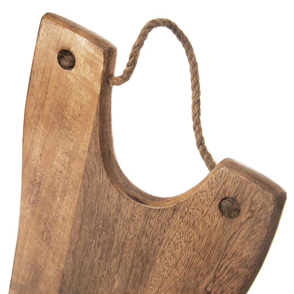Daska ima izražen, nepravilan oblik s vidljivom godovima drva i praktičnu omču od jutane vrpce za lako prenošenje i vješanje. Masivna izrada štiti radnu površinu od ogrebotina i osigurava dug vijek trajanja.