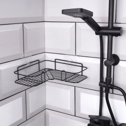 Samoljepljiva kutna polica za tuš odlično je rješenje za svaku kupaonicu u modernom loft stilu. Zahvaljujući robusnoj metalnoj konstrukciji s mat crnim praškastim lakom čvrsta je, izdržljiva i jednostavna za čišćenje. Prikladna je za odlaganje šampona, gelova, četki i spužvica, a može se koristiti i u kuhinji kao polica za začine. U paketu su prozirne samoljepljive podloge za brzu ugradnju bez oštećenja pločica.