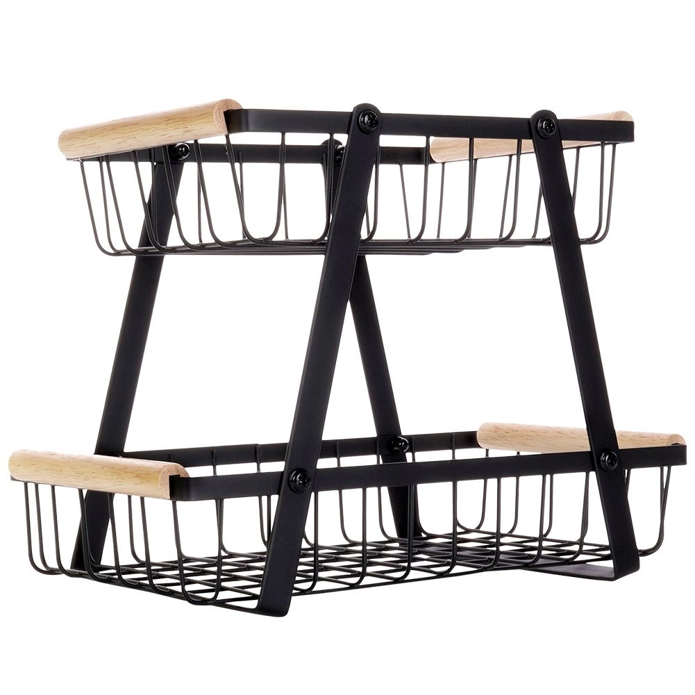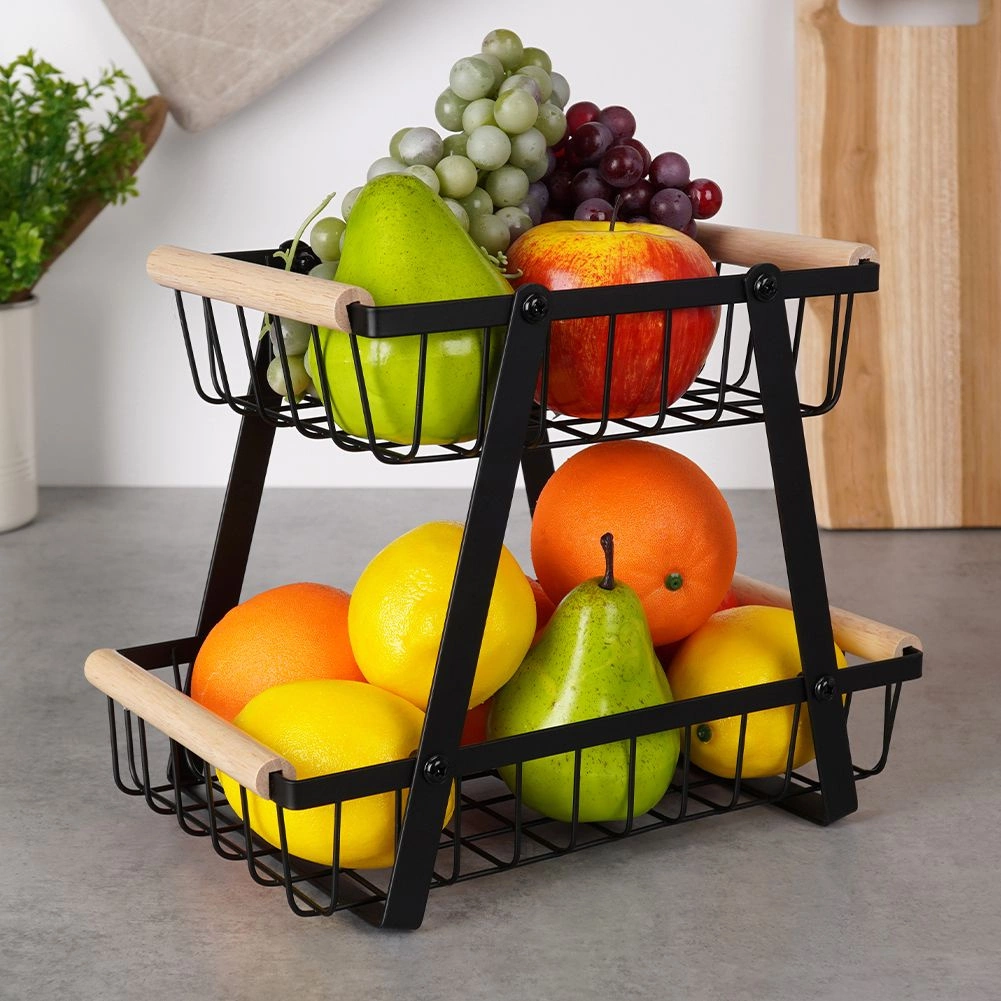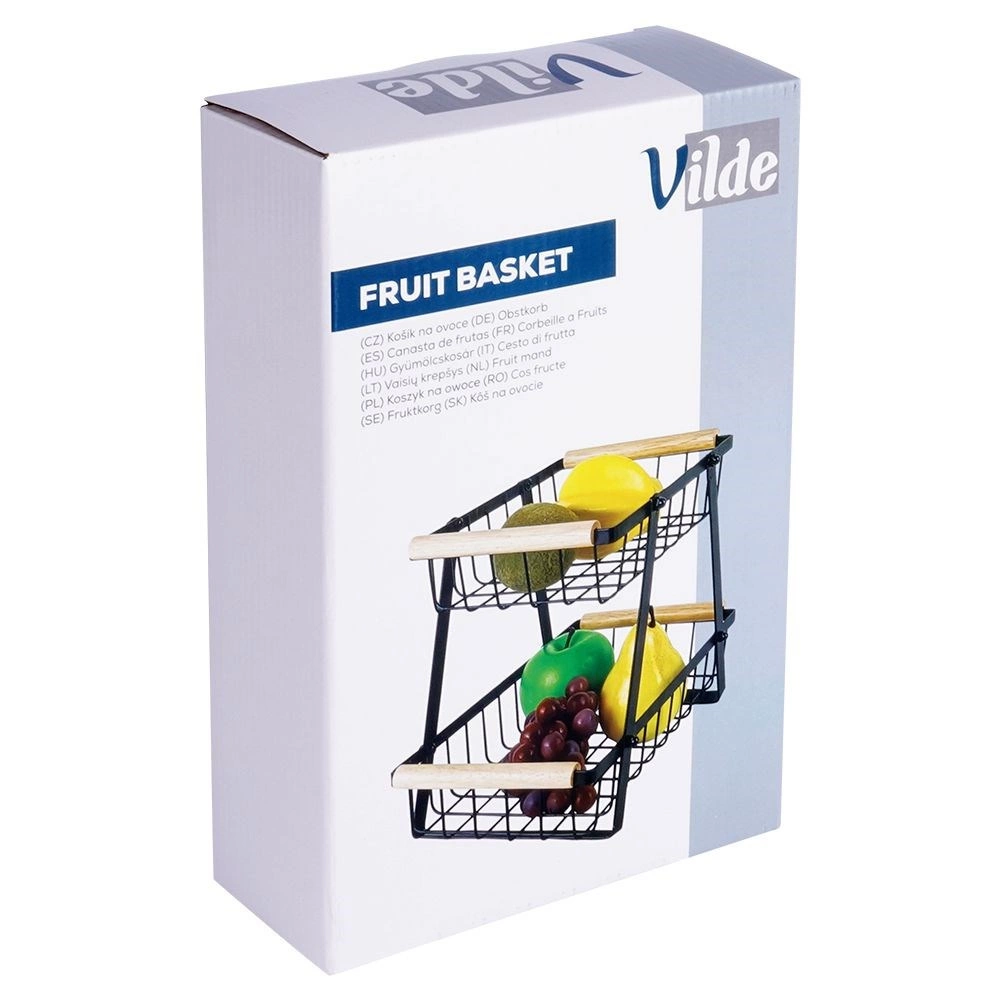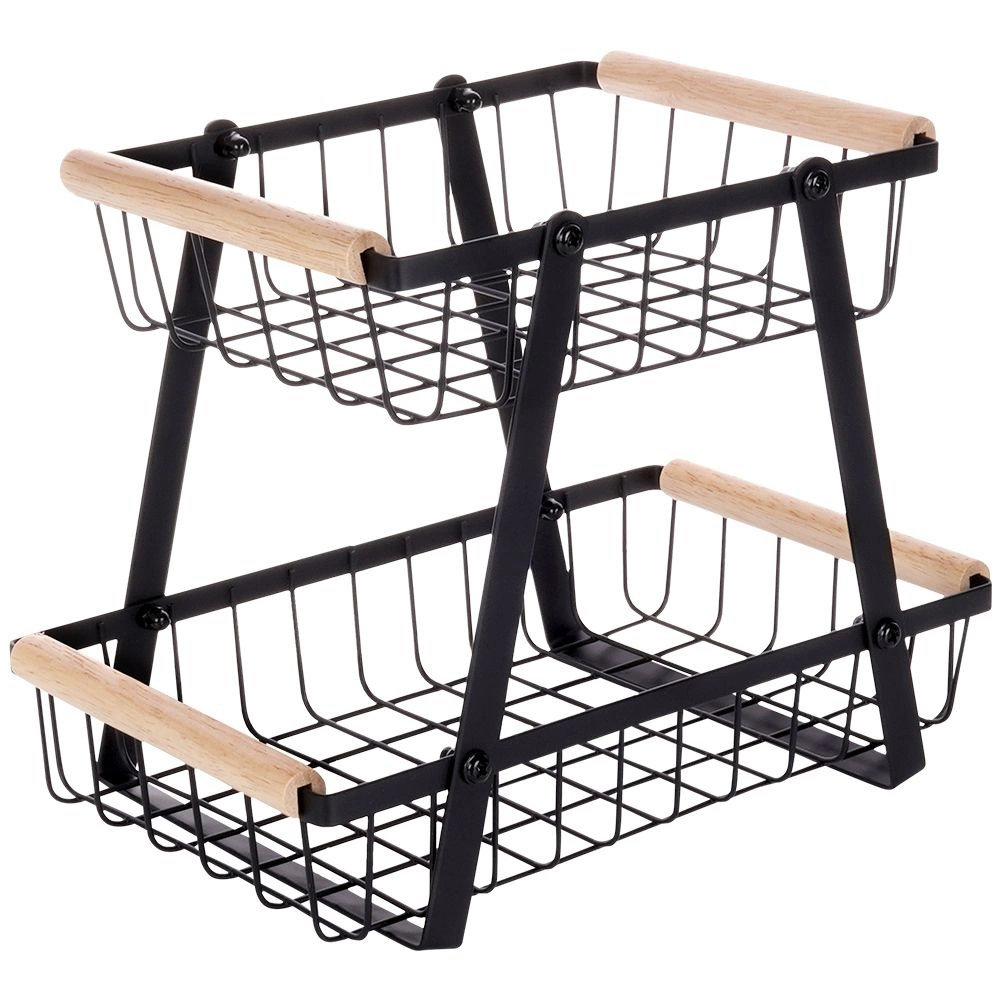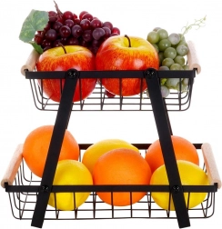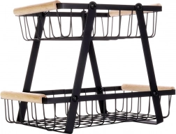 Ova dvoslojna metalna košara spaja moderan industrijski izgled s visokom funkcionalnošću. Otvorene žičane stranice osiguravaju optimalno strujanje zraka, zahvaljujući čemu voće i povrće dulje zadržavaju svježinu. Drvene ručke jamče udobno prenošenje, a cijeli stalak je zahvaljujući čvrstoj konstrukciji izdržljiv i stabilan.