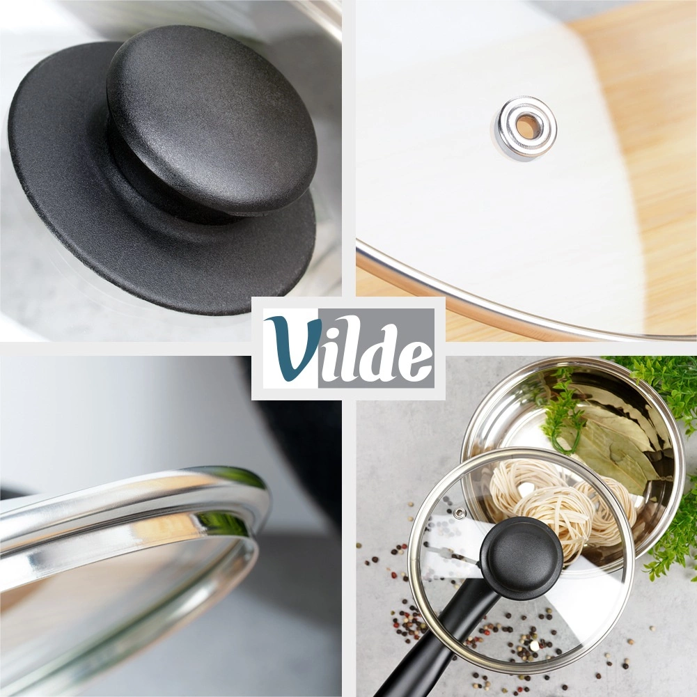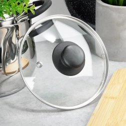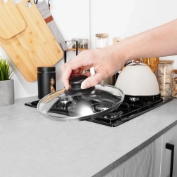 Zahvaljujući prozirnom staklu možete udobno pratiti tijek kuhanja i minimalizirati gubitak topline. Integrirani otvor za odzračivanje učinkovito odvodi višak pare, što sprječava prekuhavanje i onečišćenje ploče za kuhanje. Visok rub osigurava čvrsto prianjanje uz rub posude i smanjuje prskanje.