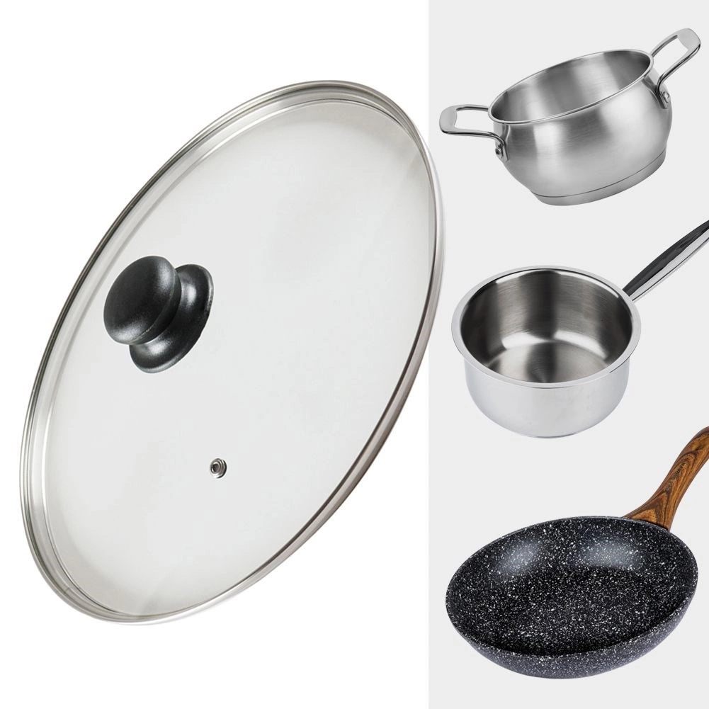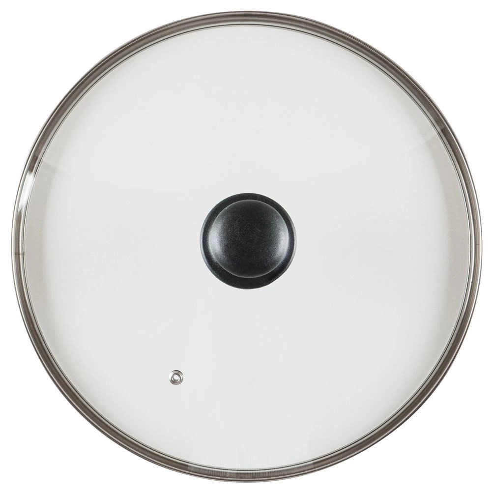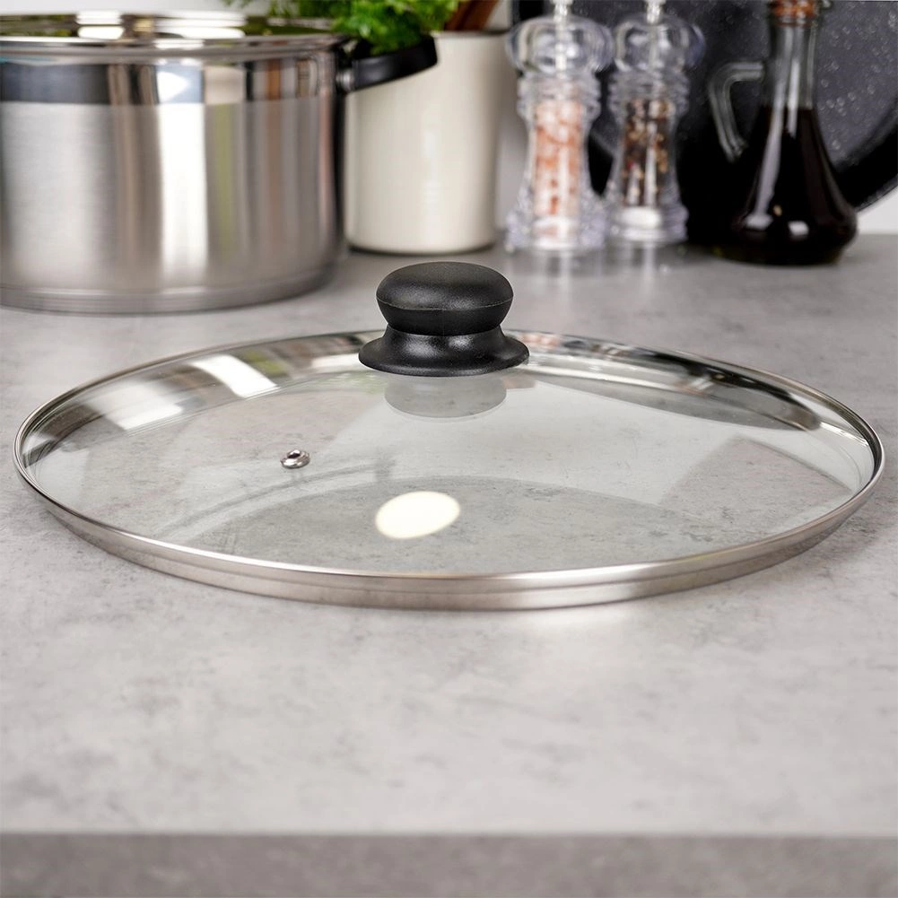 Poklopac je izrađen od žarootpornog stakla s inox obrubom u elegantnoj srebrnoj boji i izdržljivom plastičnom ručkom u crnoj boji. Blago je ispupčen za bolju cirkulaciju vrućeg zraka te je opremljen ventilacijskim otvorom za sigurno otpuštanje viška pare. Visok rub osigurava čvrsto i tijesno naleganje na rub posude.