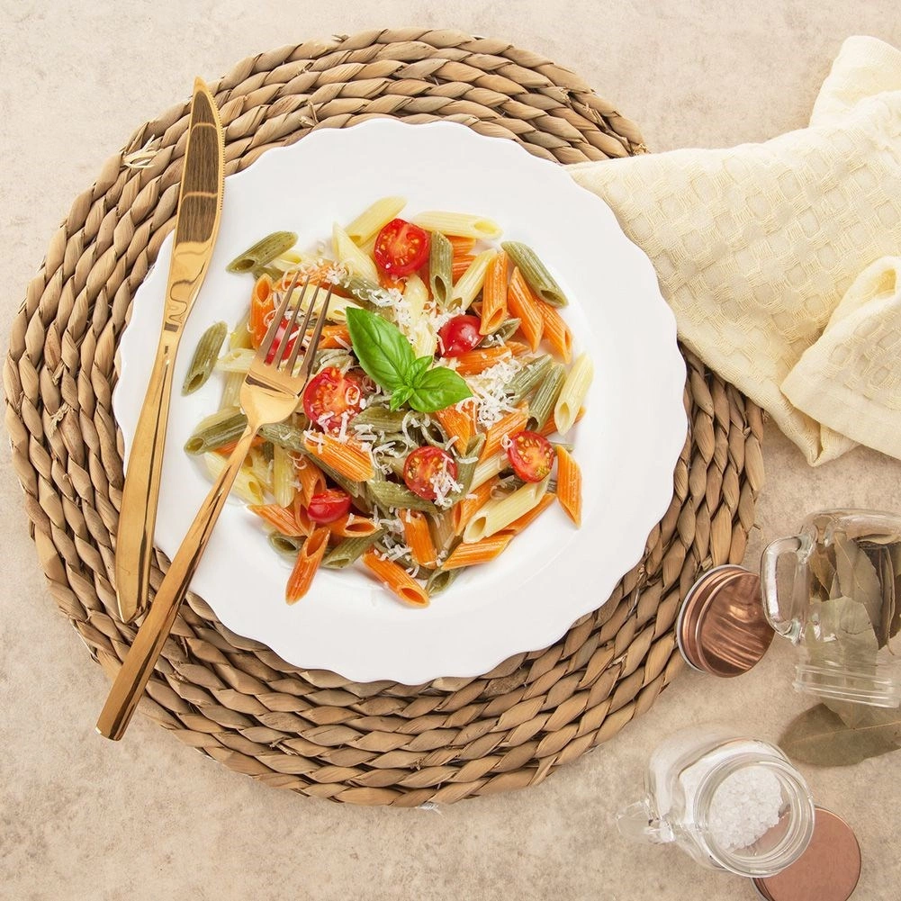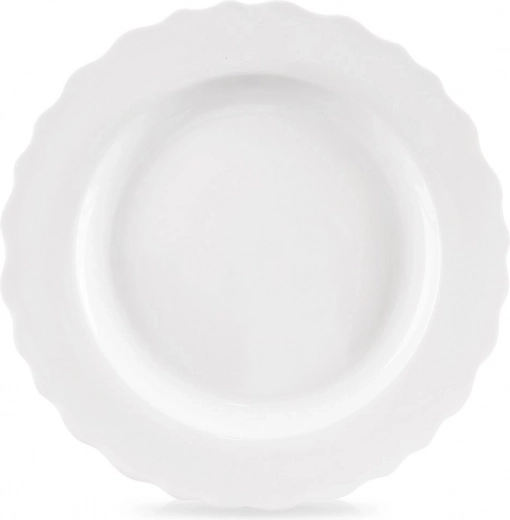 Univerzalni porculanski tanjur MONA ističe se čistom bijelom bojom i elegantnim valovitim rubom koji podiže izgled svakog posluživanja. Zahvaljujući promjeru od 24,5 cm idealan je za ručak, večeru i veće deserte te se odlično kombinira s ostalim komadima iz iste serije.