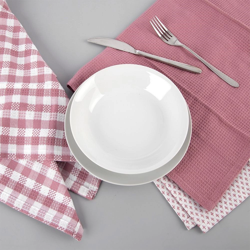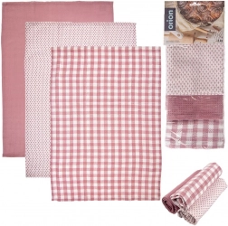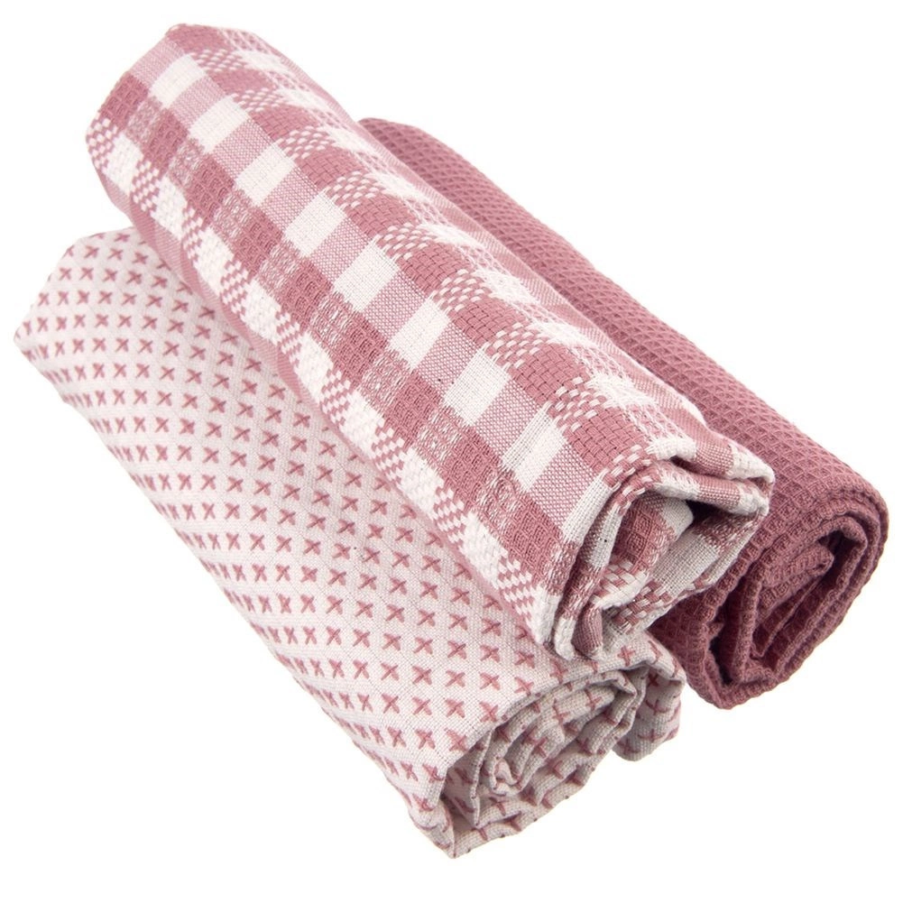 Otkrijte kvalitetne kuhinjske krpe koje spajaju funkcionalnost i stil. Tri različita uzorka u nježnim ružičastim nijansama osvježit će vašu kuhinju, dok prirodno pamučno vlakno osigurava brzo i učinkovito sušenje posuđa i radnih ploha.