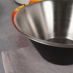 Ova univerzalna kuhinjska zdjela od kvalitetnog nehrđajućeg čelika s mat crnom vanjskom površinom postat će vaš pouzdan pomoćnik pri svakodnevnom kuhanju i svečanom posluživanju. Široki rub olakšava rukovanje i precizno prelijevanje, a dubok oblik savršen je za rad s tijestom, salatama i kremama.