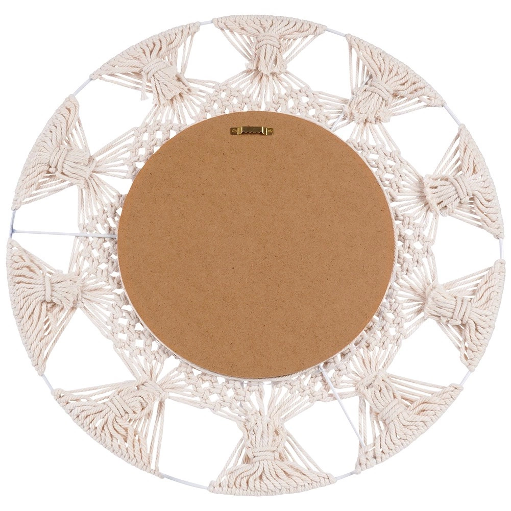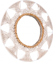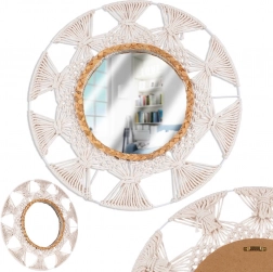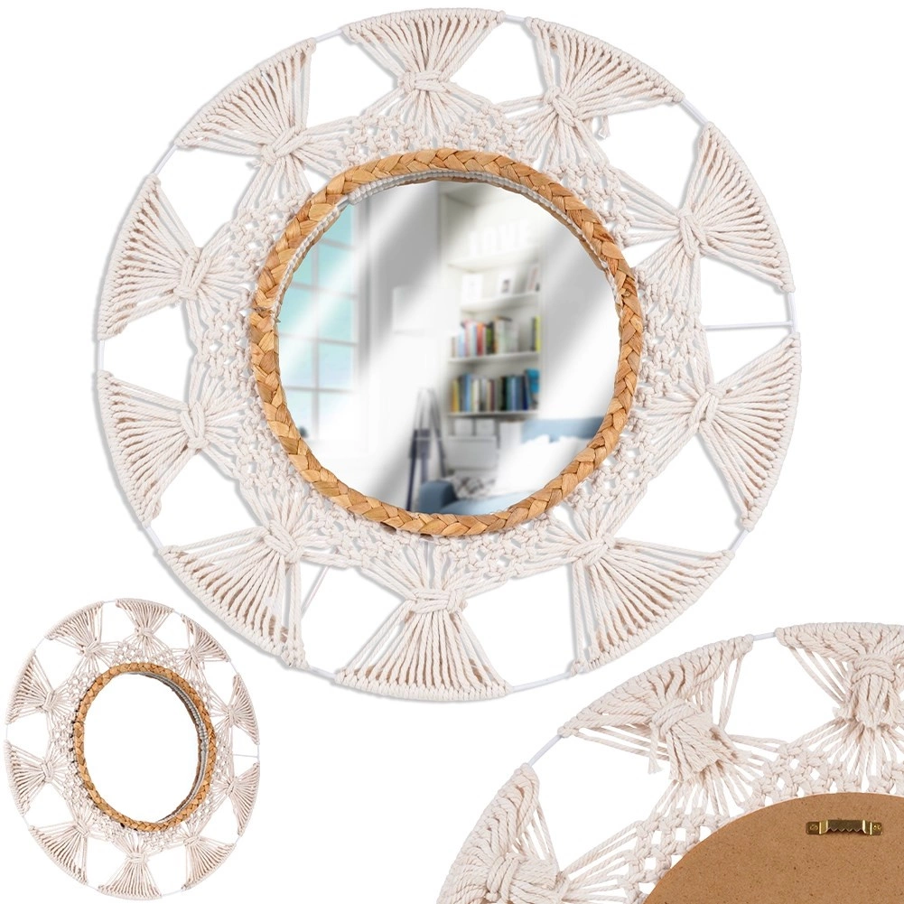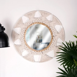 Unesite lakoću i ugodu u interijer s okruglim ogledalom u omiljenom boho stilu. Kombinacija bež pamučnog pletenja nalik makrameu i dekorativnog prstena od morske trave stvara jedinstven akcent na zidu. Ogledalo pruža oštar i prirodan prikaz te služi kao praktičan i dekorativan istaknuti detalj.