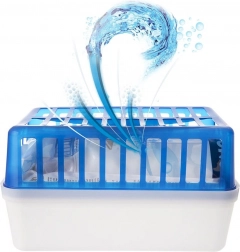 Zamjenjivi granulat radi 2–5 mjeseci ovisno o vlazi i temperaturi prostora (preporučeno za prostorije do cca 50 m²). Prikupljena voda nakuplja se na dnu posude – nakon punjenja dovoljno je spremnik sigurno izliti, a nakon isteka učinka granule zamijeniti.