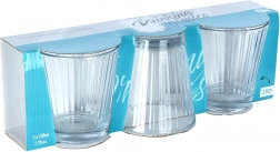 Otkrijte praktičan i bezvremenski set od 3 čaše zapremine 220 ml, savršen za vodu, limunade, sokove, ledene čajeve i miješana pića. Prozirno staklo s vertikalnim rebrima naglašava boju napitka i pruža sigurniji hvat.