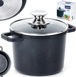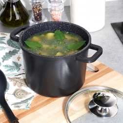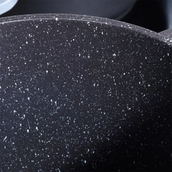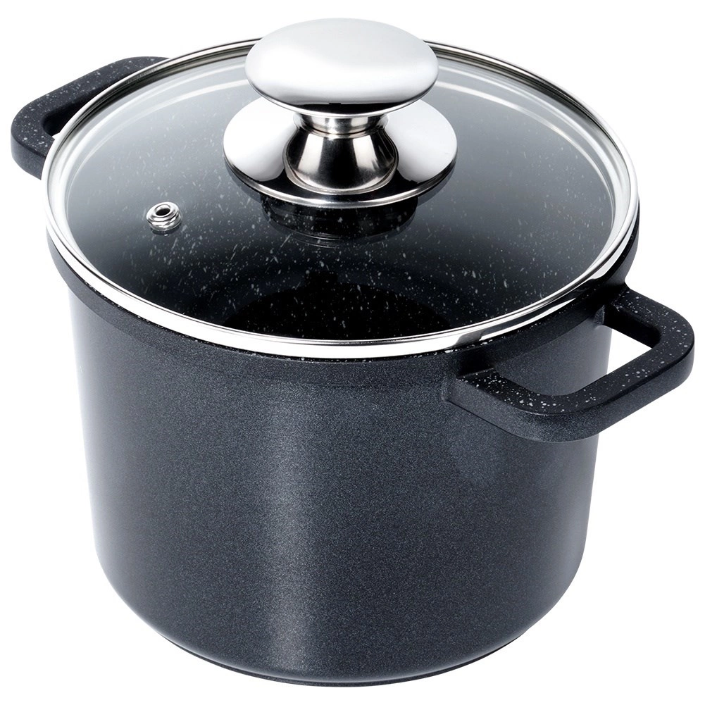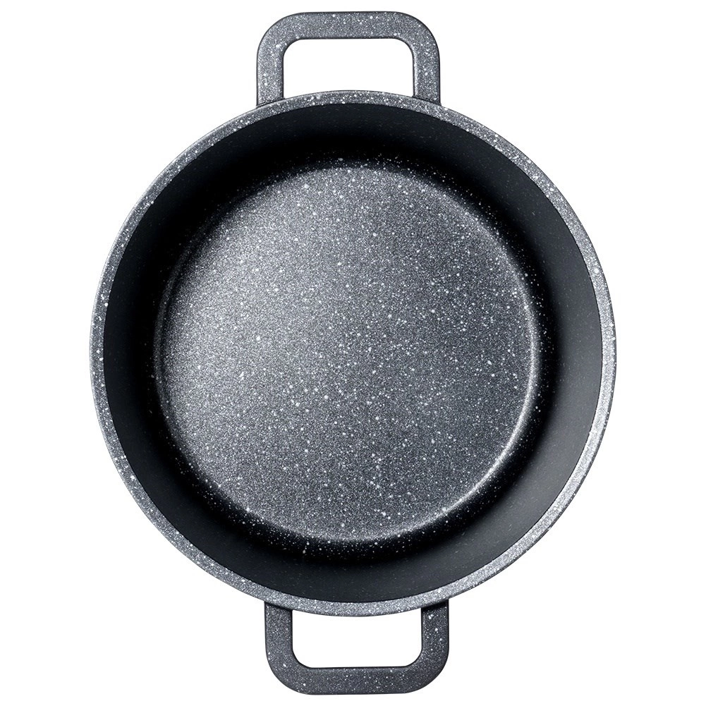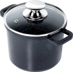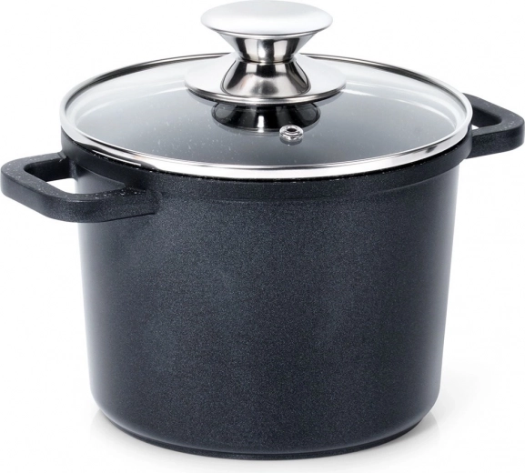 Elegantni lonac od crnog aluminija s unutarnjom granitnom neprianjajućom površinom PFLUON osigurava da se hrana ne zagorijeva, lakše se održava te zadržava prirodan okus i hranjive tvari. Stakleni poklopac s otvorom za ispuštanje pare omogućuje kontrolu kuhanja bez nepotrebnog podizanja.