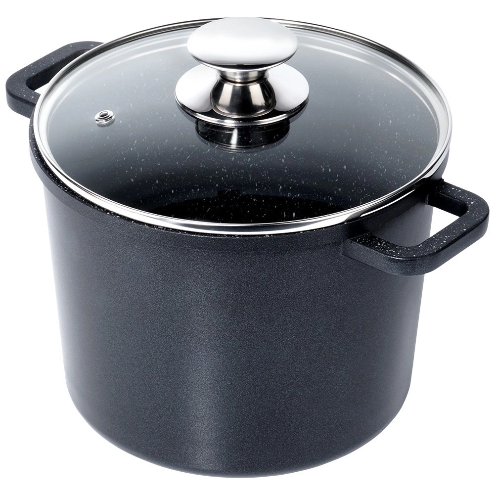 Visoki lonac GRANDE izrađen je od izdržljivog aluminija s unutarnjom neljepljivom granitnom površinom PFLUON, koja ne sadrži PFOA ni PTFE. Zahvaljujući tome pripremit ćete zdravija jela s manje masnoće i bez lijepljenja. Stakleni poklopac s inox obrubom i otvorom za ispuštanje pare omogućuje kontrolu kuhanja bez nepotrebnog podizanja poklopca.