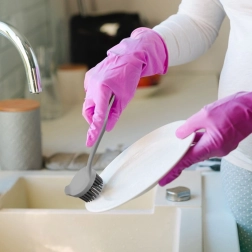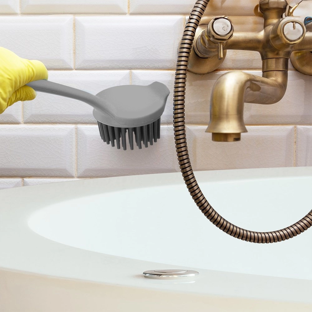 Silikonska četka za posuđe duljine 22,5 cm kombinira izdržljivo plastično tijelo u sivoj boji s gustim silikonskim vlaknima u grafitnoj nijansi. Svestrana je: izvrsno pere tanjure, lonce i tave, ali pomaže i pri čišćenju sudopera, fuga, kutova te kupaonskih površina.