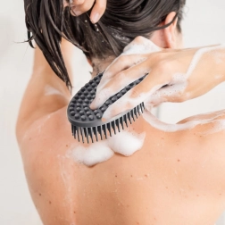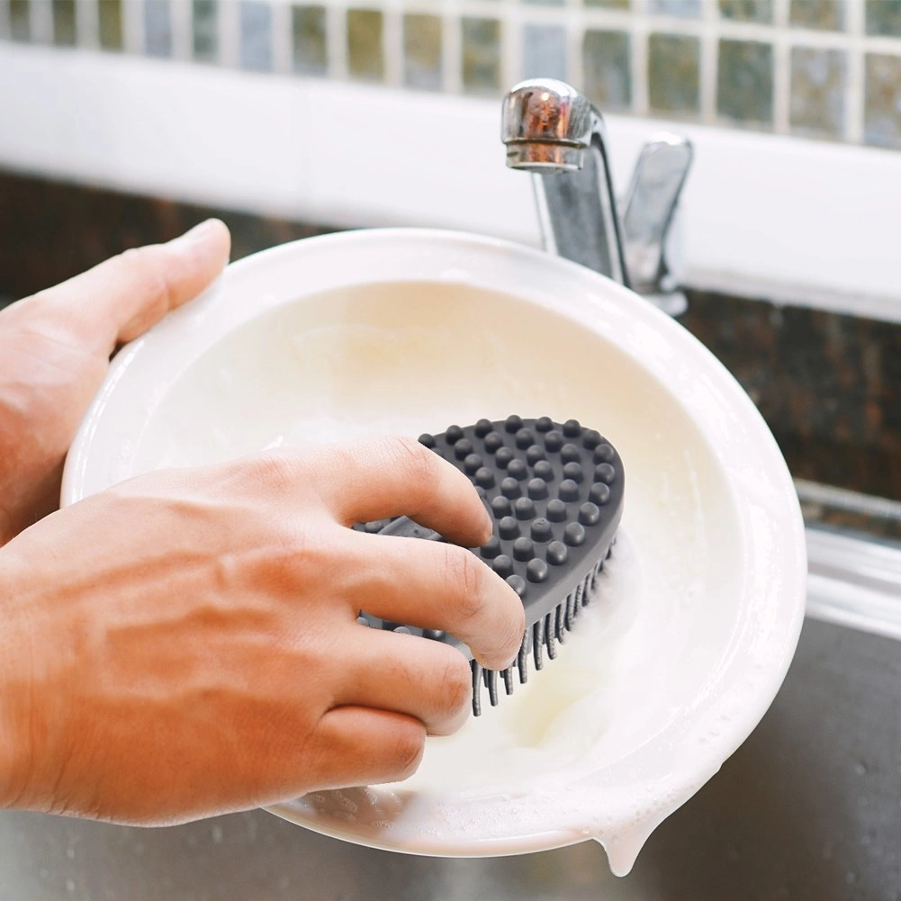 Ova praktična silikonska spužvica 2u1 spaja učinkovito čišćenje s nježnom njegom. Obostrani dizajn nudi dulja mekana vlakna za uklanjanje nečistoća i masnoće te drugu stranu s okruglim izbočinama za nježno ribanje i ugodnu masažu. Zahvaljujući vrlo elastičnom termoplastičnom materijalu prilagođava se površinama, lako se ispire i brzo se suši.