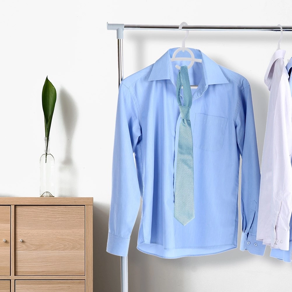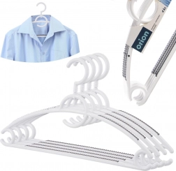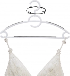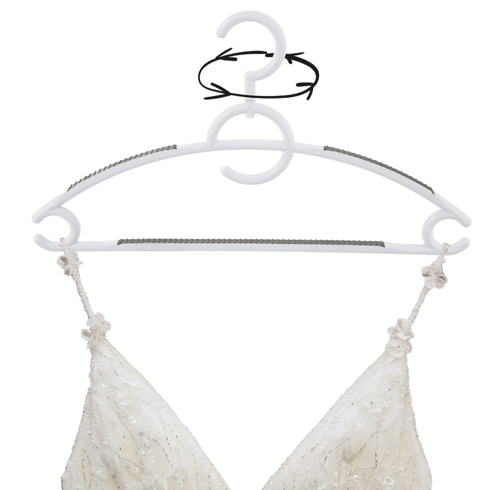 Svaka vješalica ima gumene protuklizne trake na ramenima i donjoj prečki, pa odjeća ne klizi. Tu su i bočne kuke za naramenice na haljinama te donja letvica za hlače ili šalove. Rotirajuća kuka omogućuje objesiti odjeću točno kako trebate – u ormar, na stalak ili u prodavaonici.