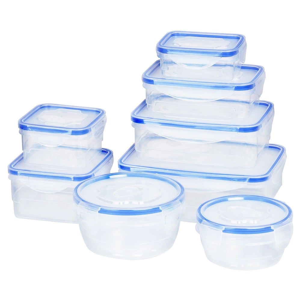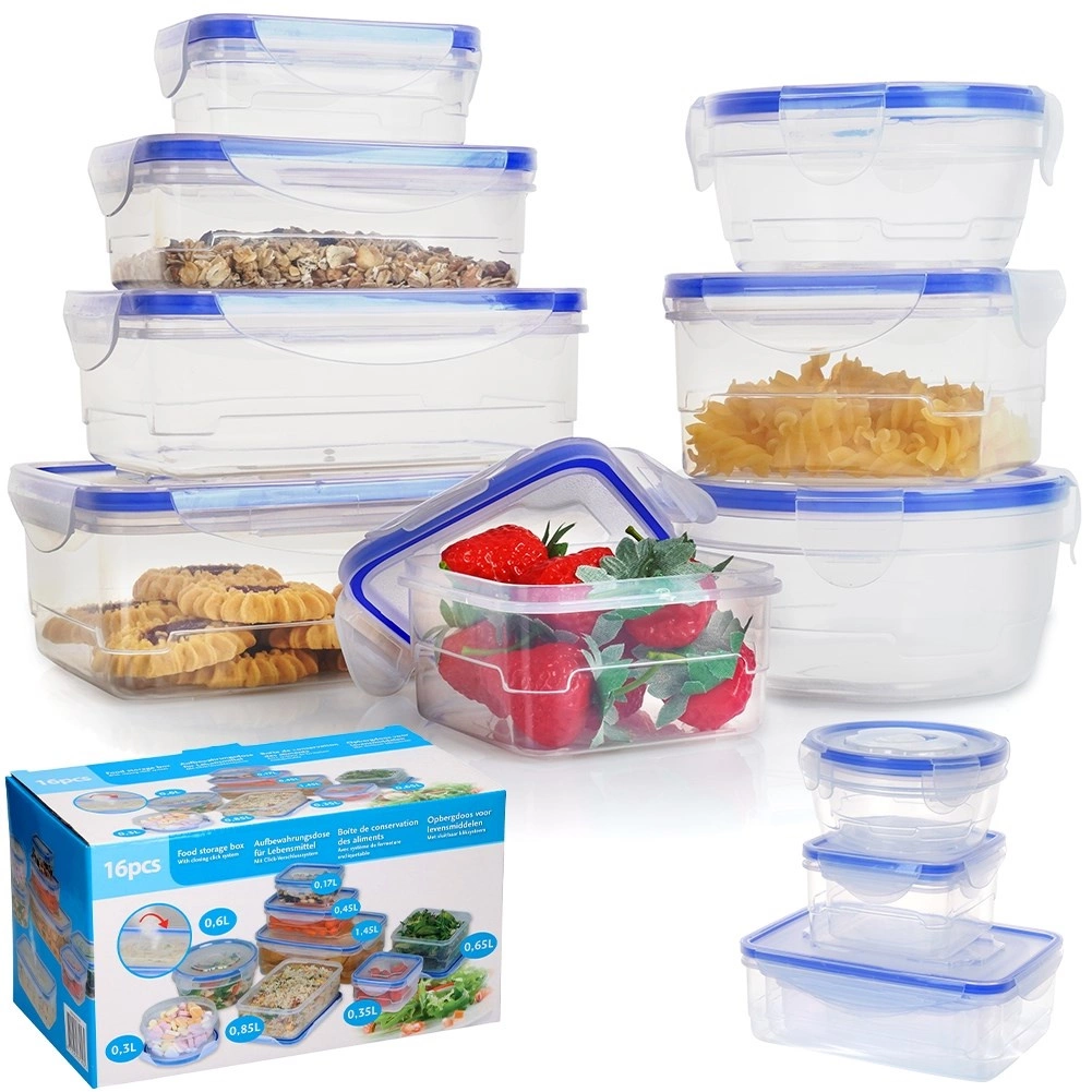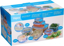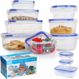 Praktičan set od 8 hermetičkih posuda za hranu s plavom silikonskom brtvom i četirima zaključavajućim kopčama. Bez BPA, izdržljive, hermetičke i nepropusne, pogodné za perilicu posuđa, mikrovalnu i zamrzivač. Različiti oblici i veličine za pregledno skladištenje tjestenine, keksa, salata, voća i ostataka jela.